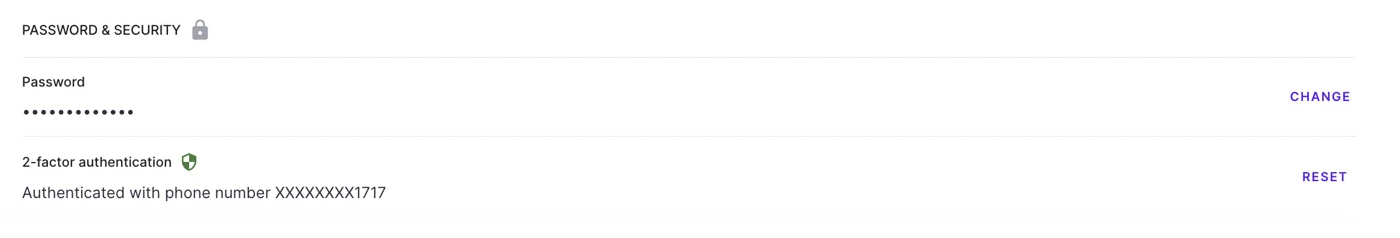 3. Under Passwords & Security, click the RESET button next to 2-factor authentication