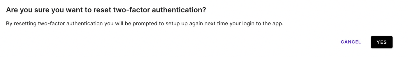 4. A confirmation modal will populate confirming you'd like to reset 2FA. Click Yes.