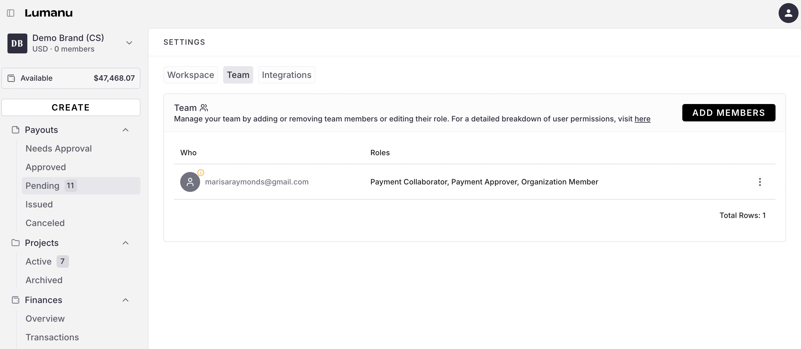 Click Add Members. Enter the email address of the team member you'd like to invite, along with the role you'd like to grant their user.
