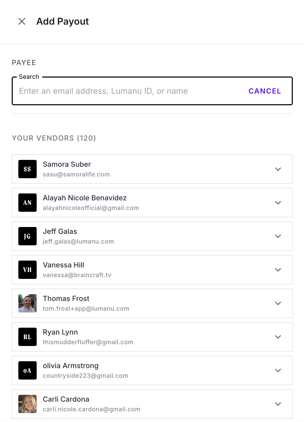 Select a vendor from your vendor list, or search by email address, Lumanu ID, or name.