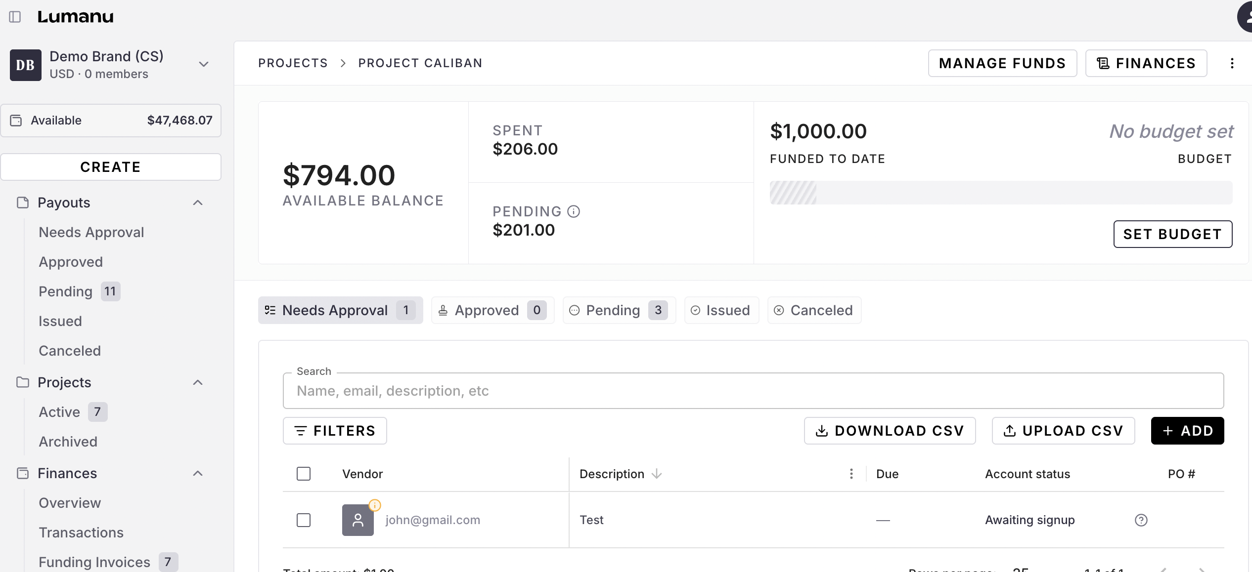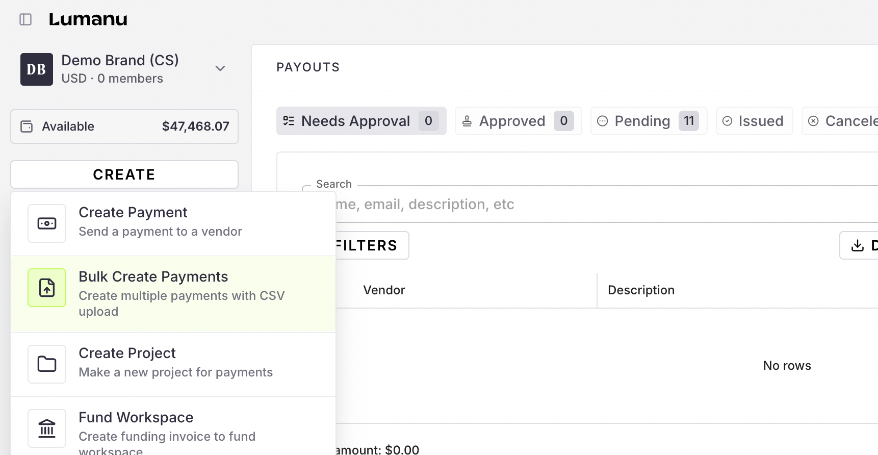 Lumanu’s CSV upload functionality can be used to easily bulk create invoices for all of your vendors at once.