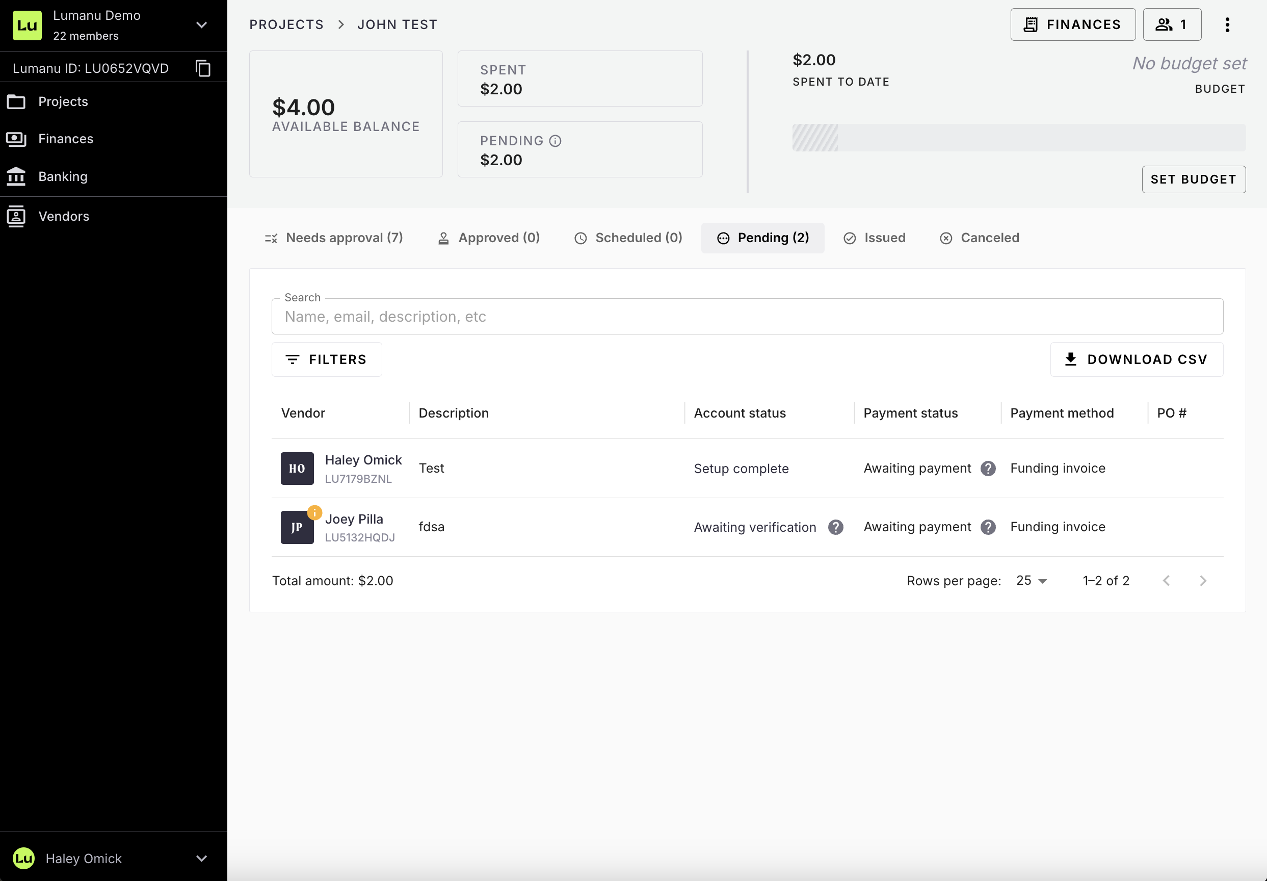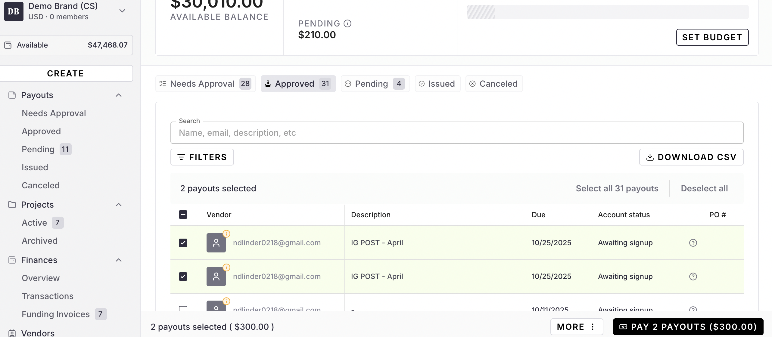 Vendor invoices that are awaiting payment via a funding invoice can be found in the Payments pending tab with the status awaiting funds.