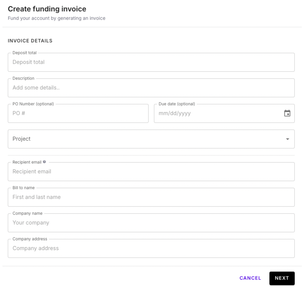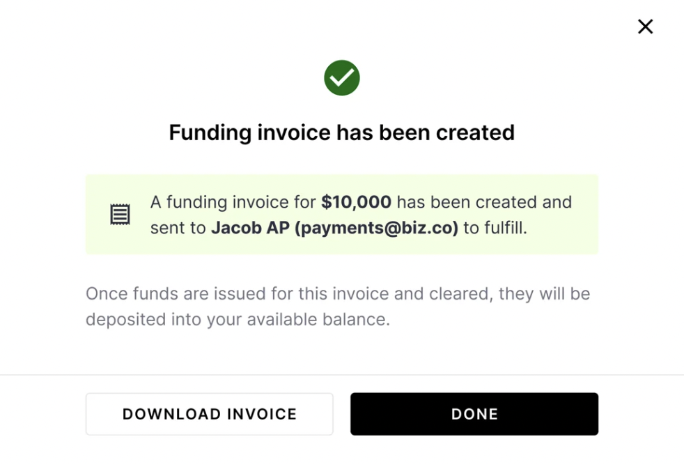 Confirm the details input and click Generate invoice. The funding invoice will be sent to the recipient email input to be fulfilled.