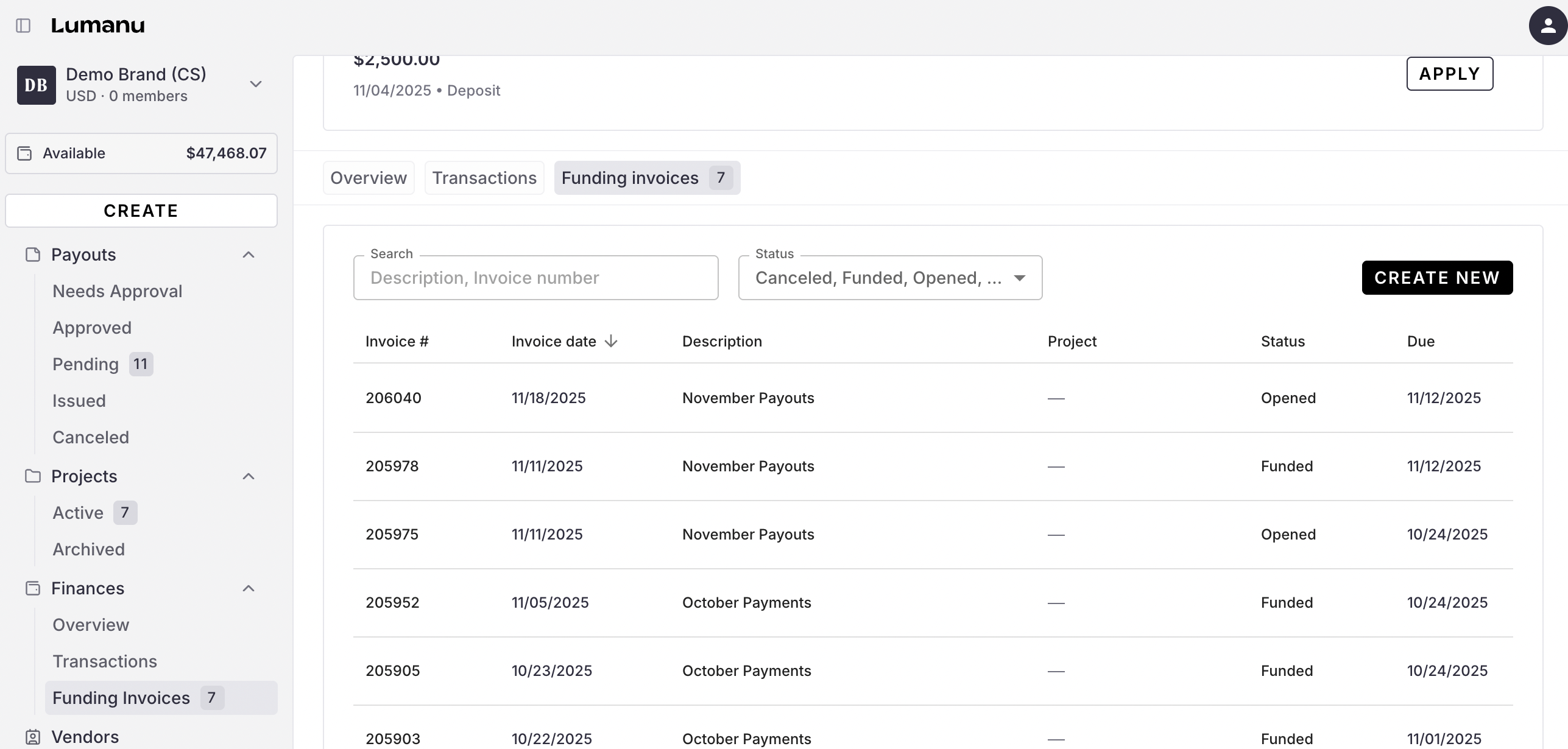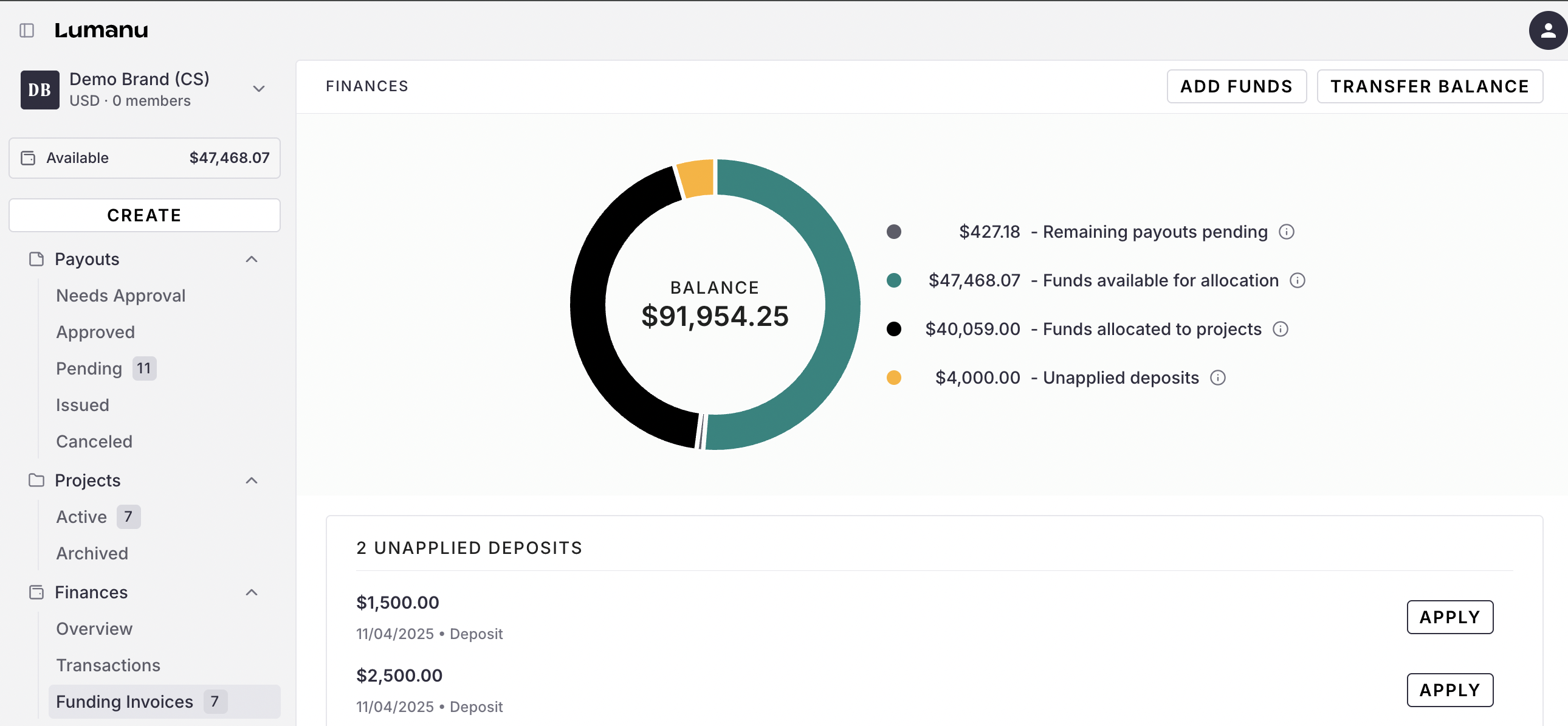 For a walk through of how to apply deposits to funding invoices, see this help article.