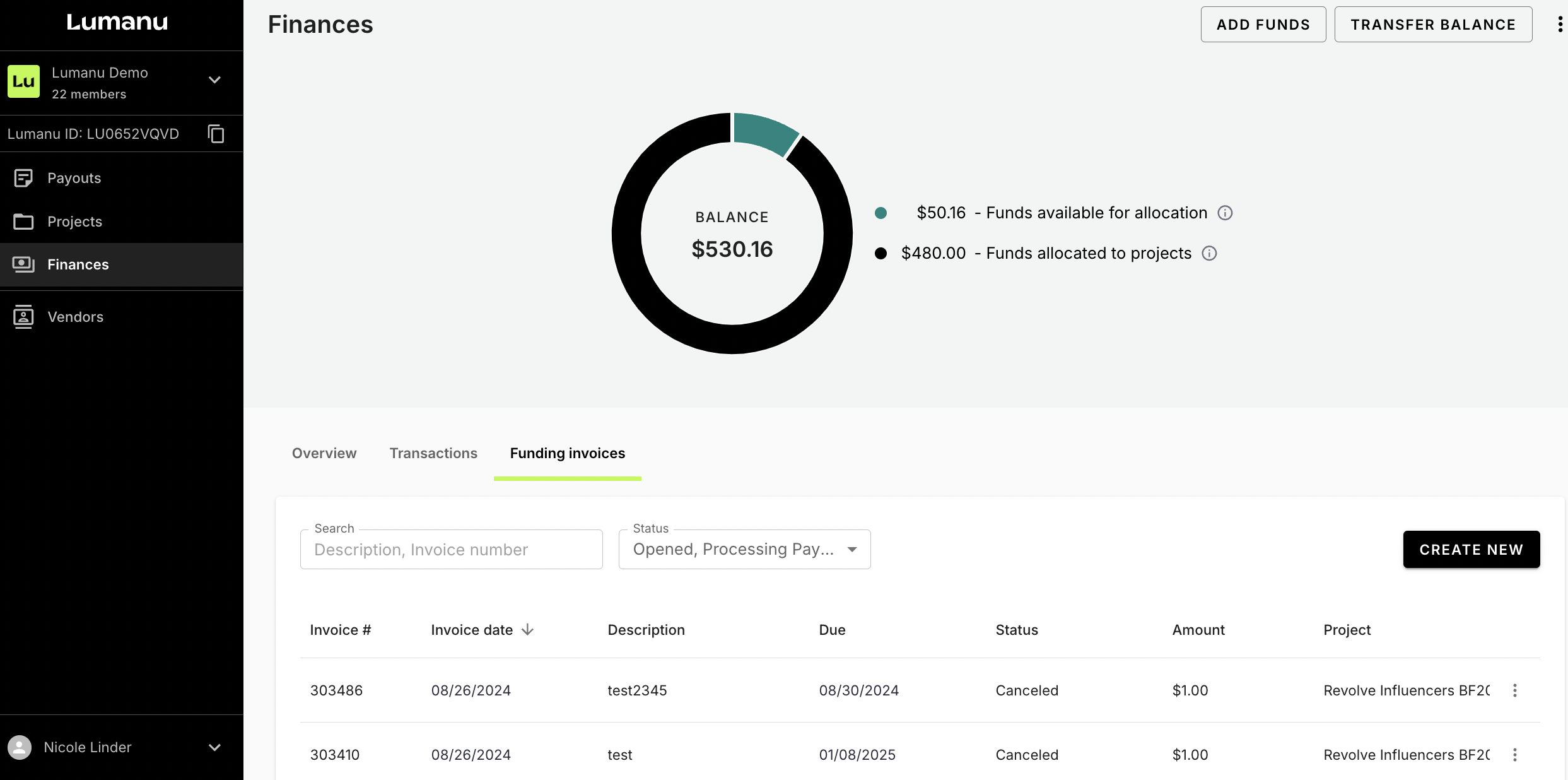 6. Track applied deposits and their associated Funding invoices under the Funding invoices tab.