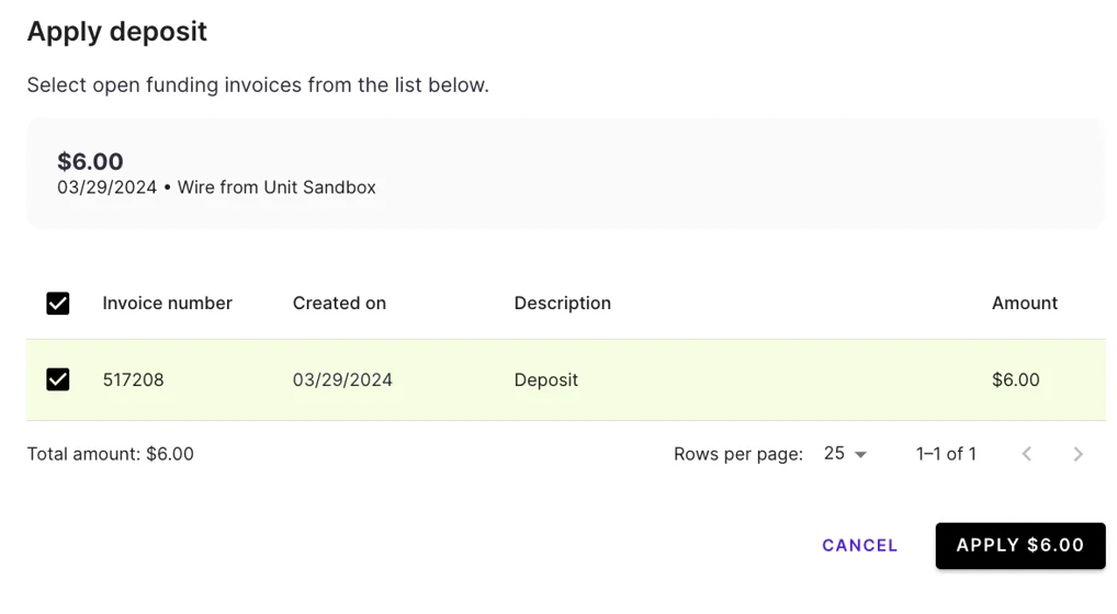 4. Select the funding invoice(s) tied to this deposit and click Apply.