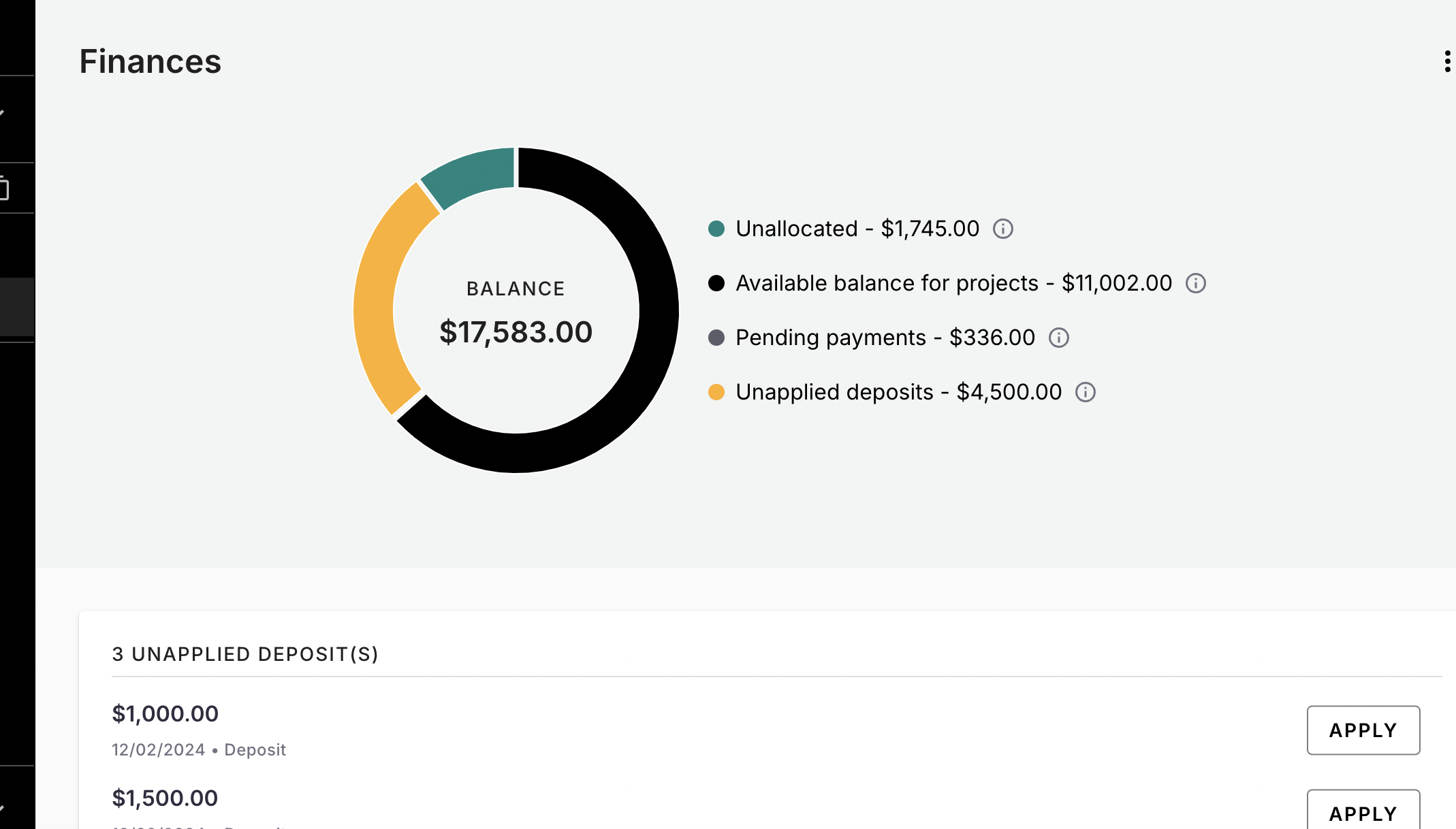2. All received deposits will display under the Finances summary in the Unapplied deposits section.