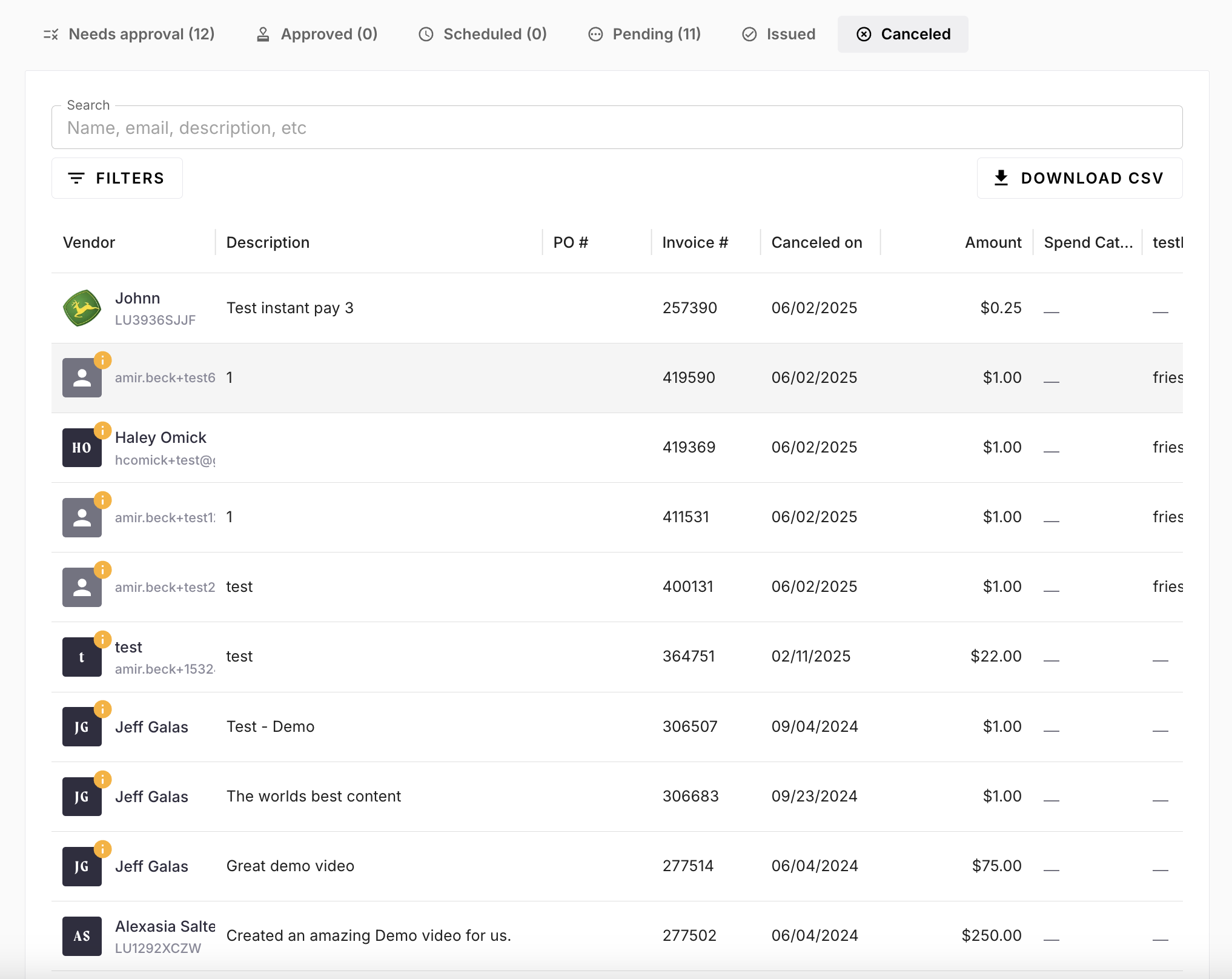 Any Vendor invoice canceled within the Needs Approval or Payments Pending tab by you or one of your team members