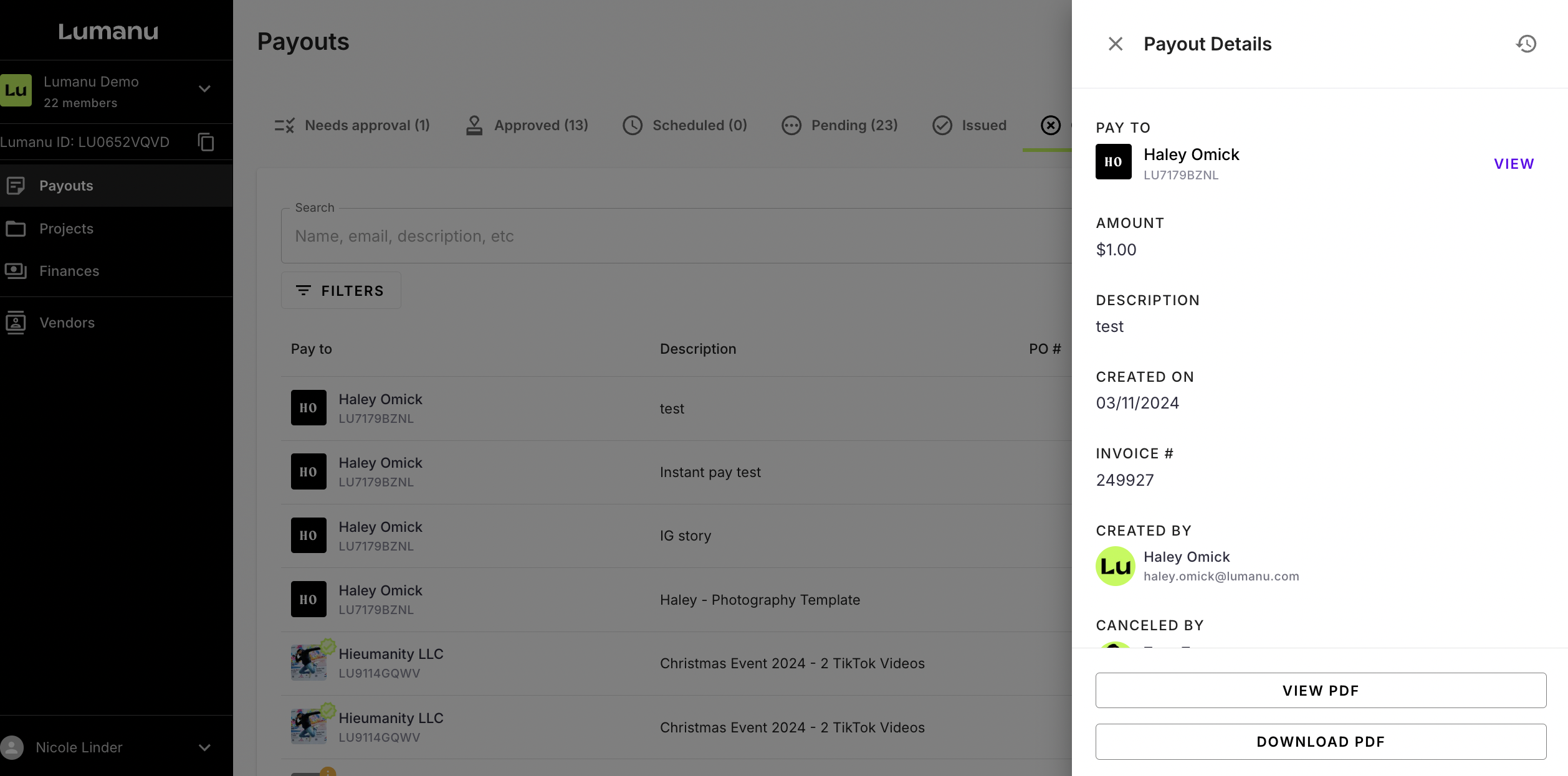 Lumanu's Canceled tab is a historical log of every invoice that's been canceled for any reason within your workspace.