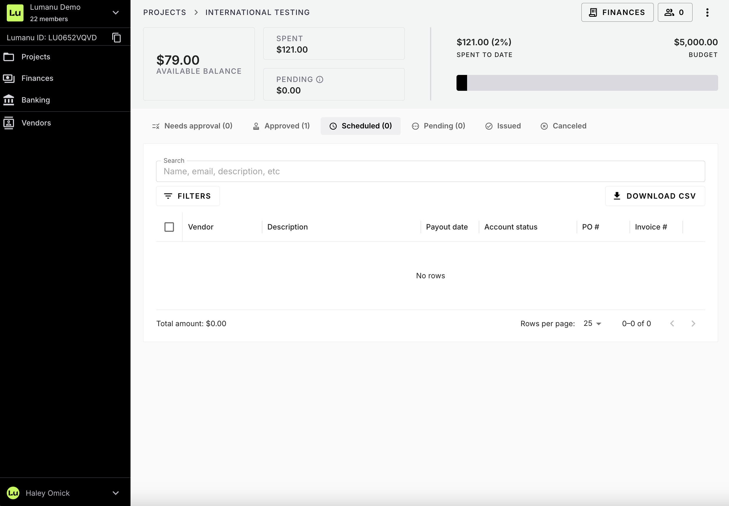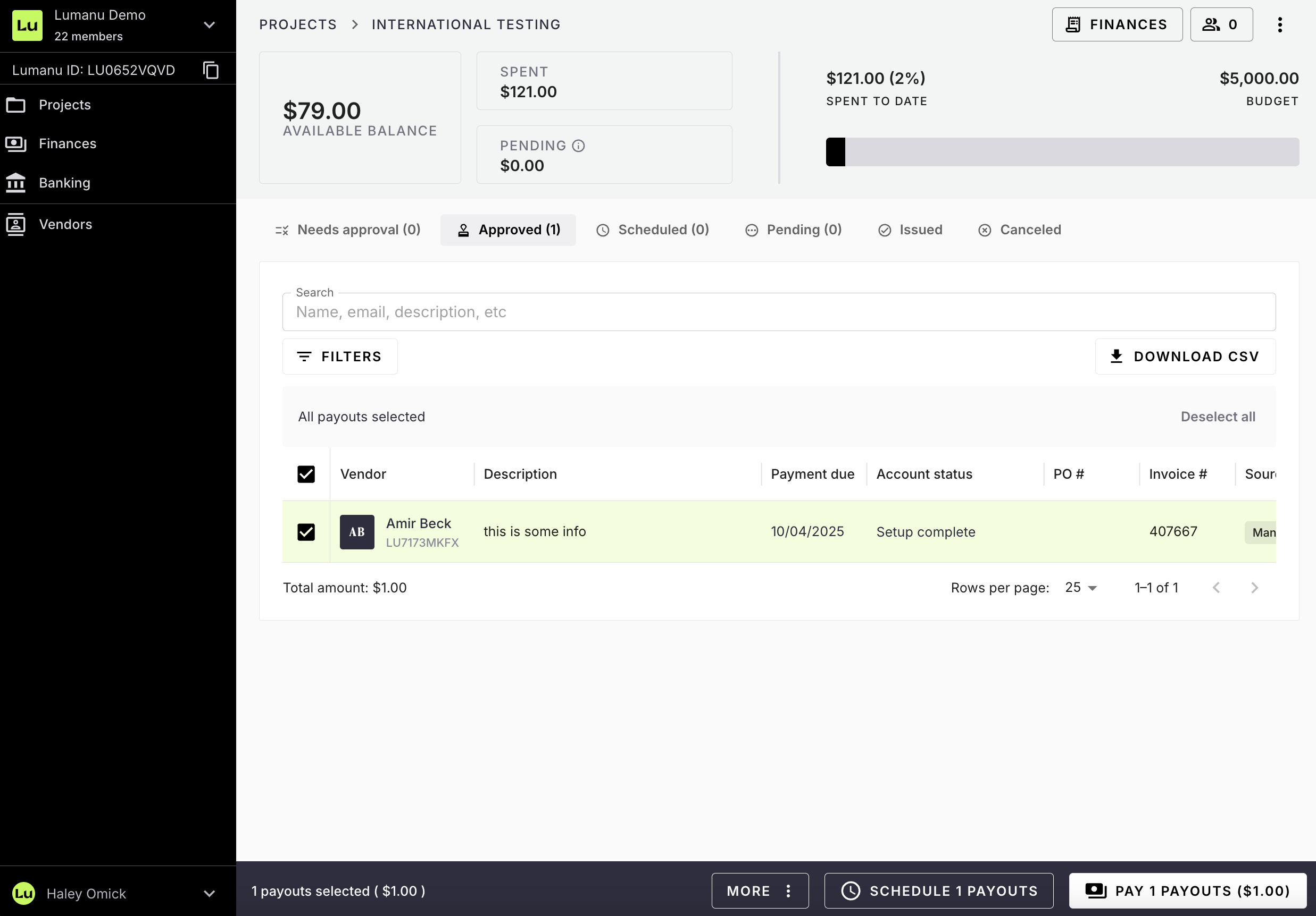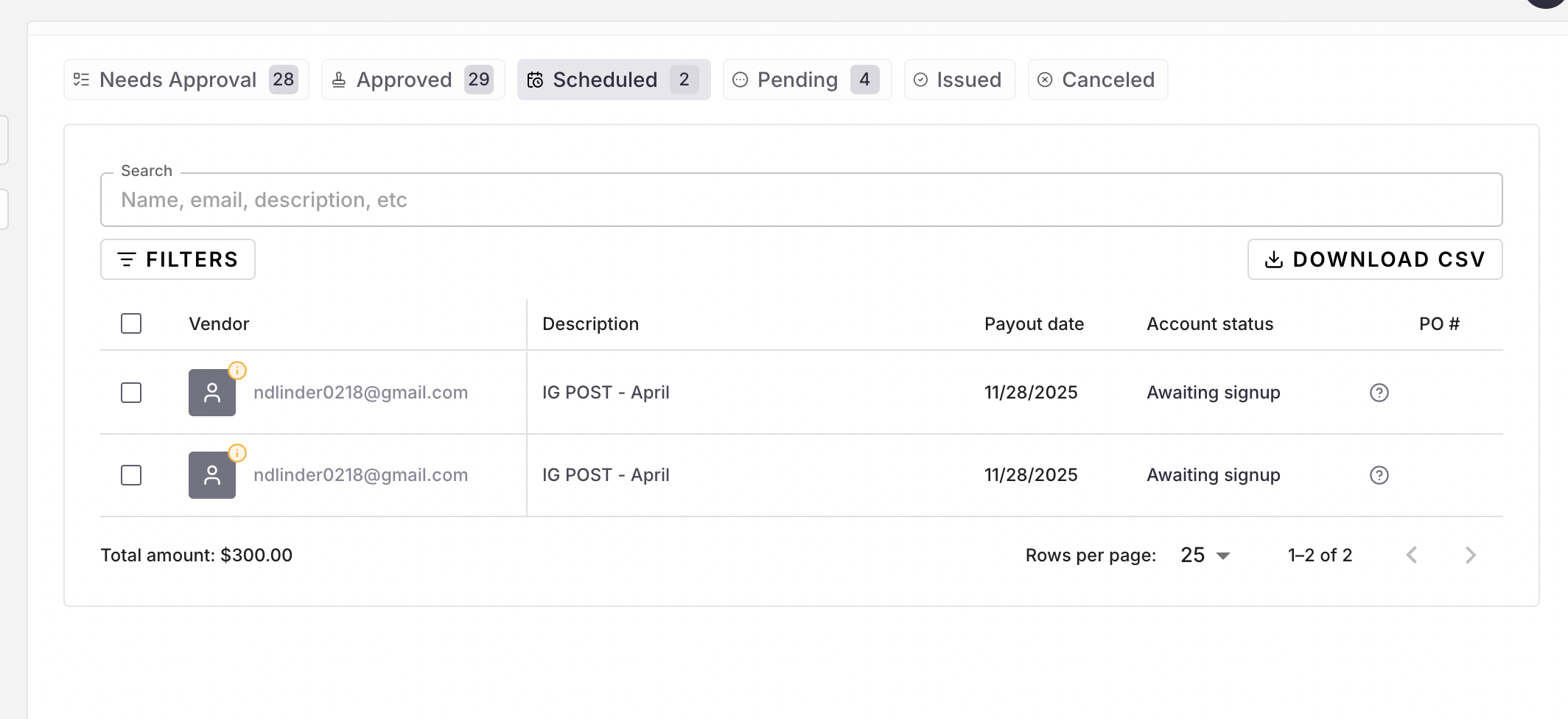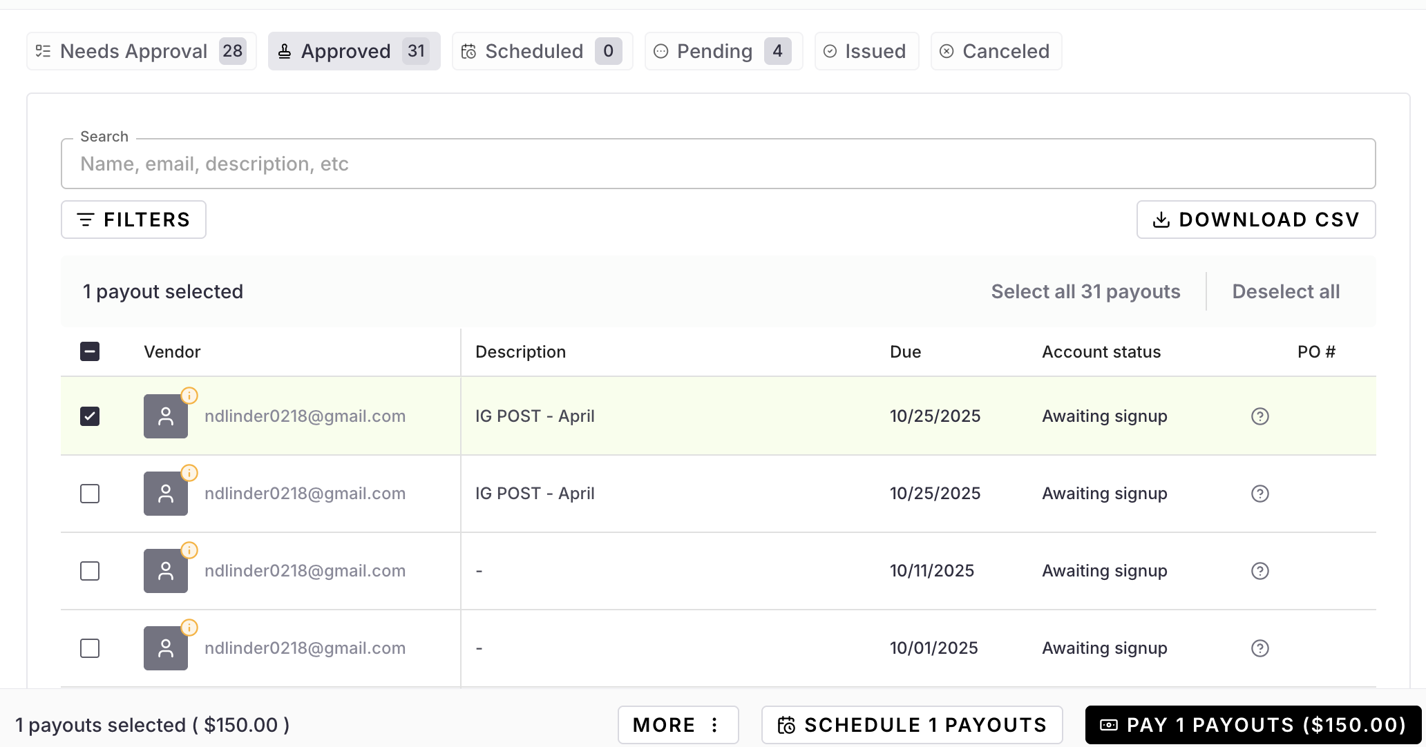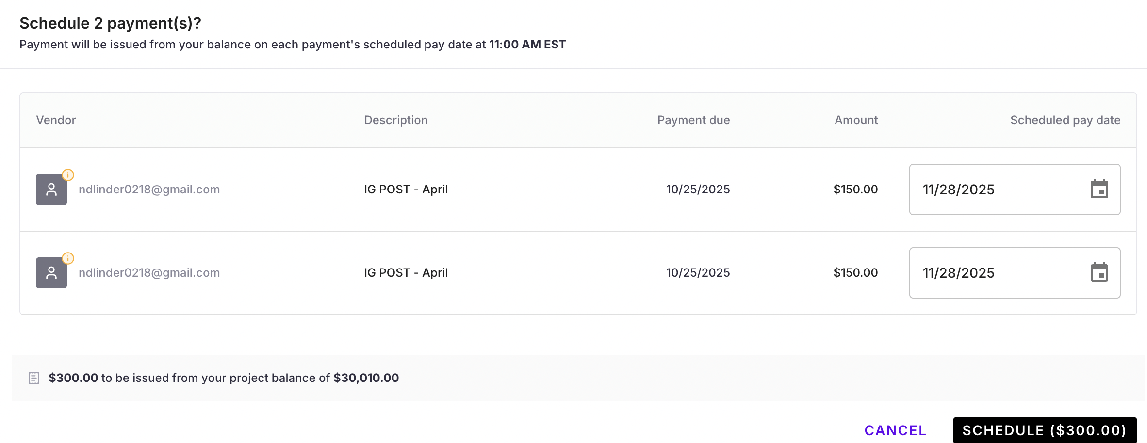 Streamline your workflow by scheduling payments to be auto-issued from your pre-funded balance at a future date.