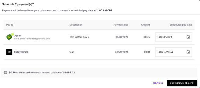 🚨 If your balance is not enough to cover the total of the selected payments, you will be unable to schedule.