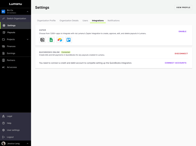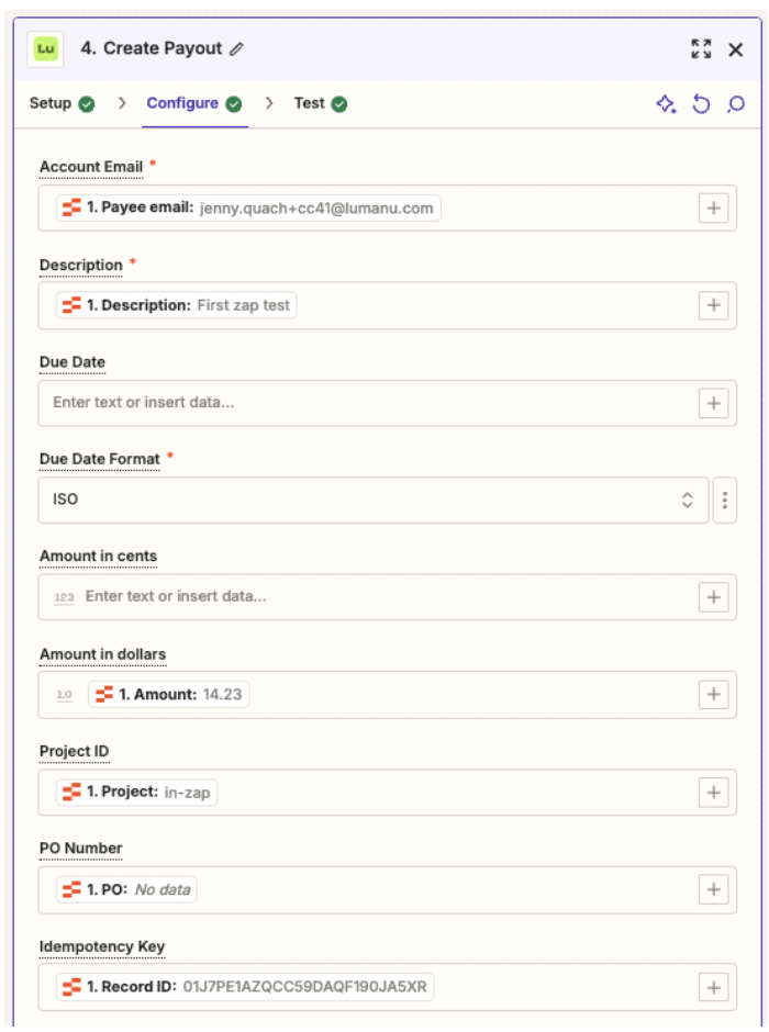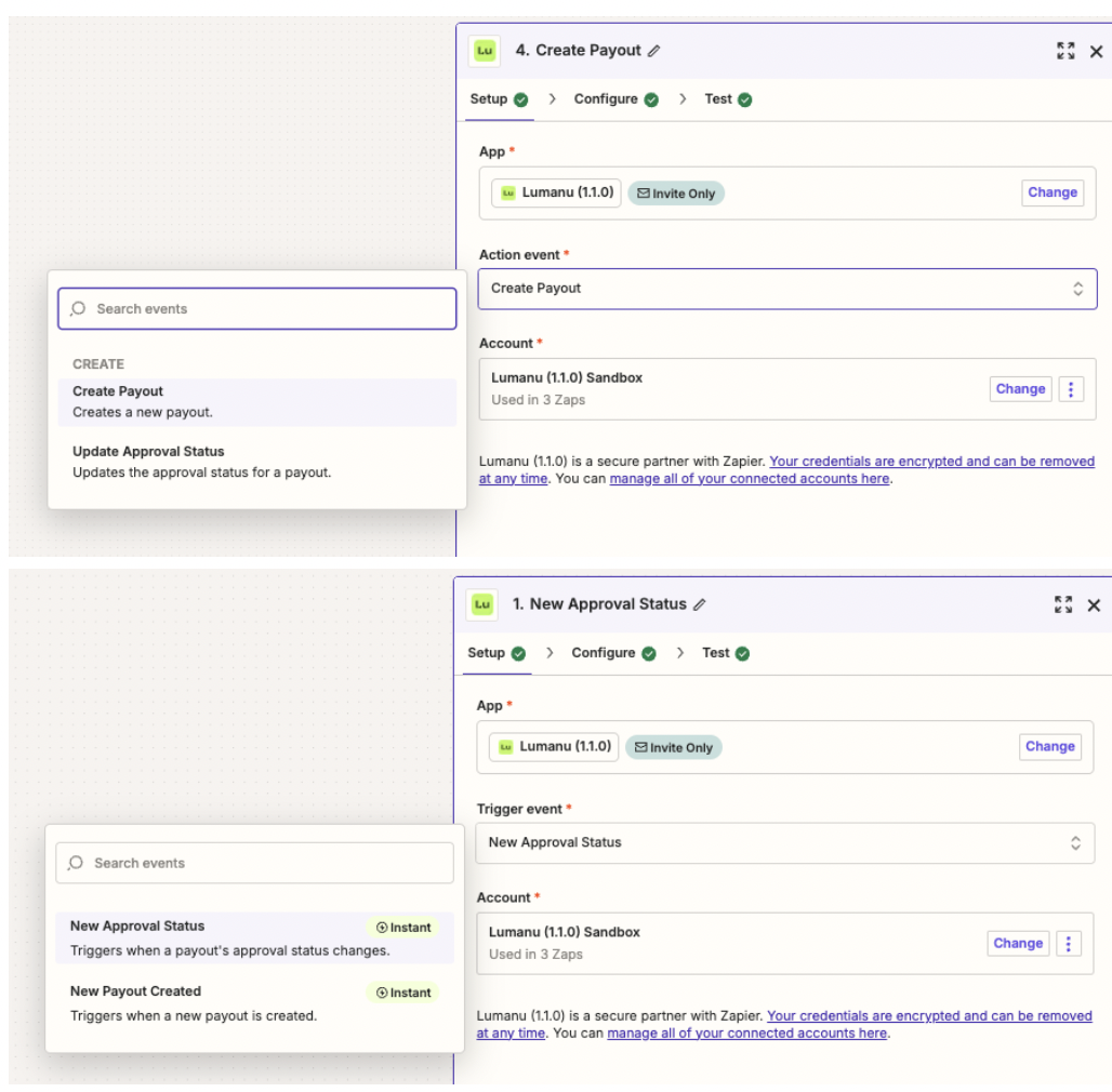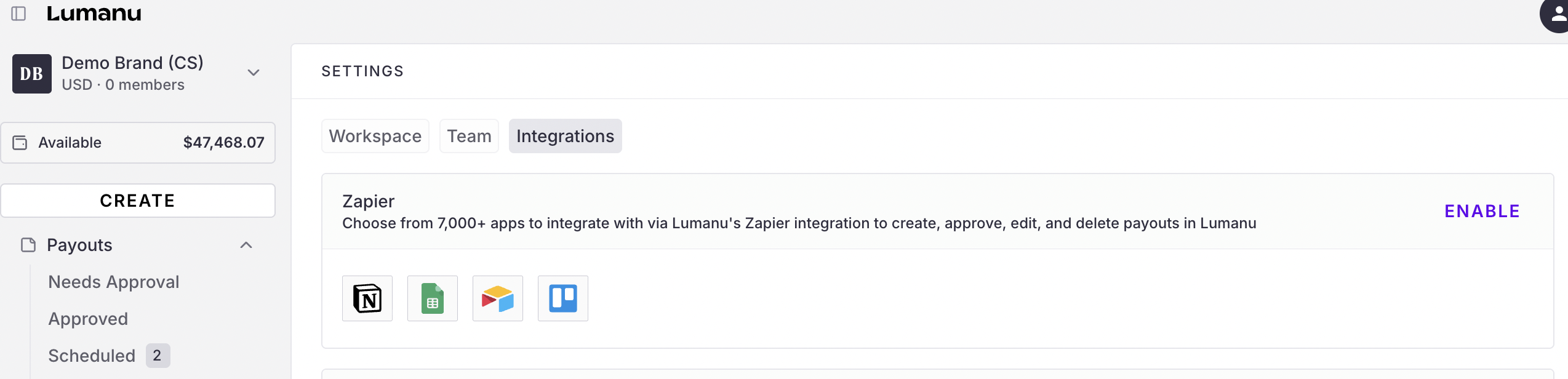 Choose from 7,000+ apps to integrate with via Lumanu's Zapier integration to create and approve payouts in Lumanu.