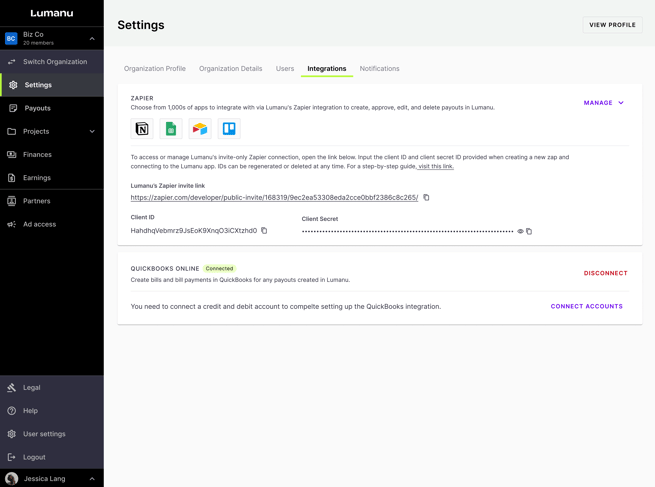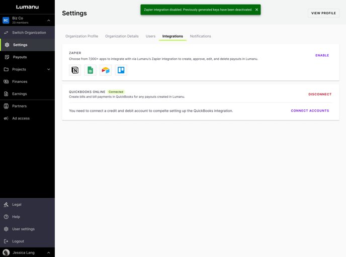 To generate new keys, re-enable the integration and complete the Zapier set-up steps another time.