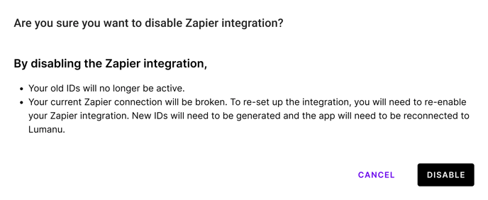 Once confirmed, your IDs will be deactivated and your Zapier integration will be disabled.