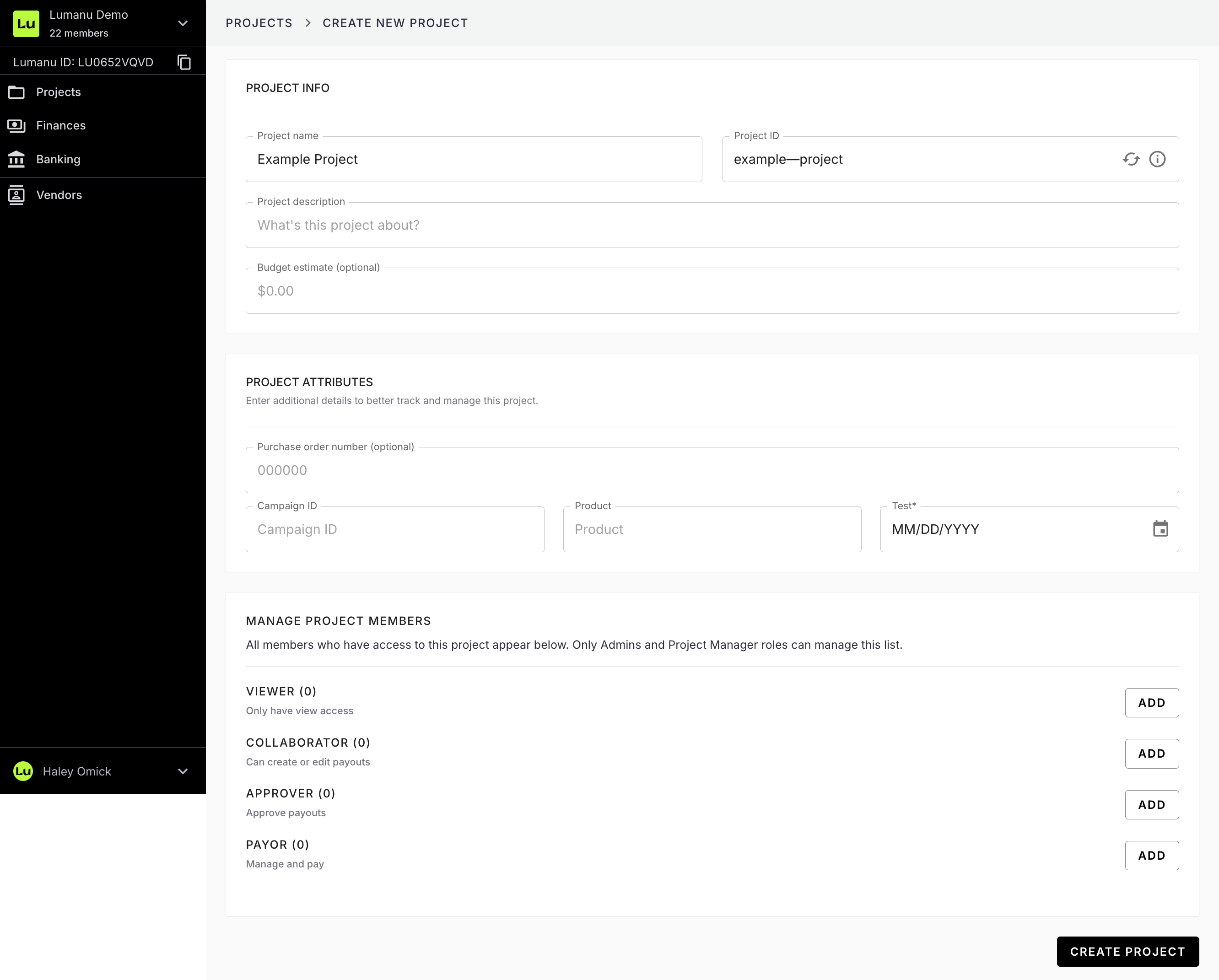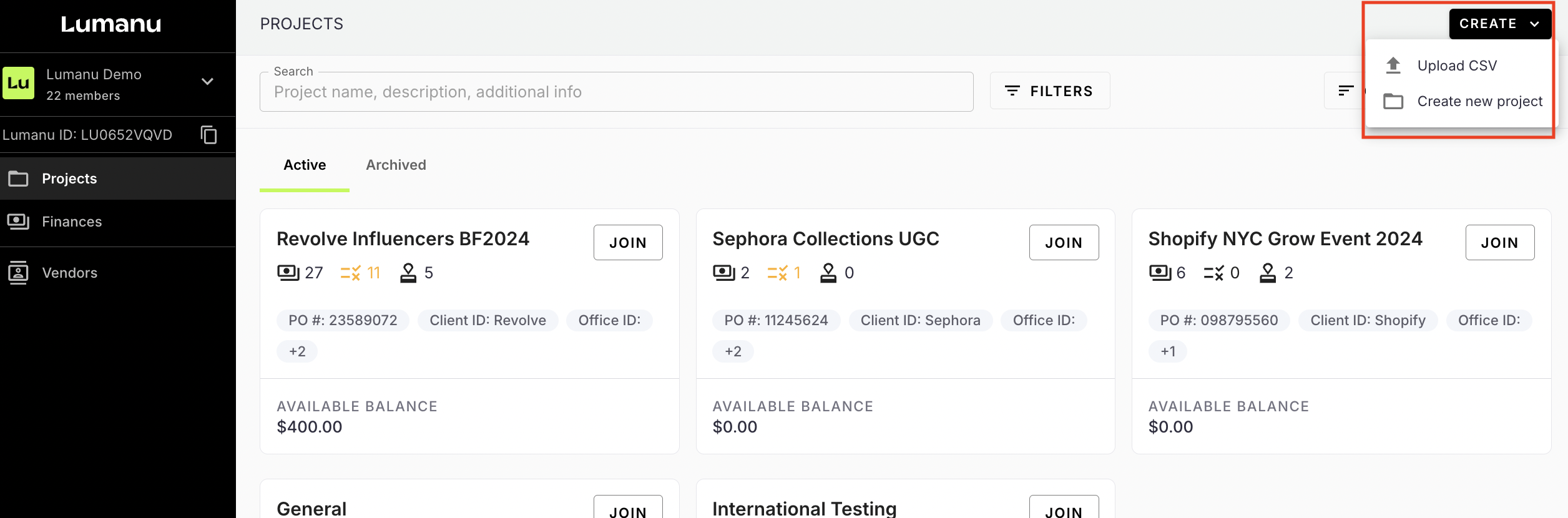 A Lumanu Project is a folder that your team can use to categorize payouts based on campaign, client, or budget.