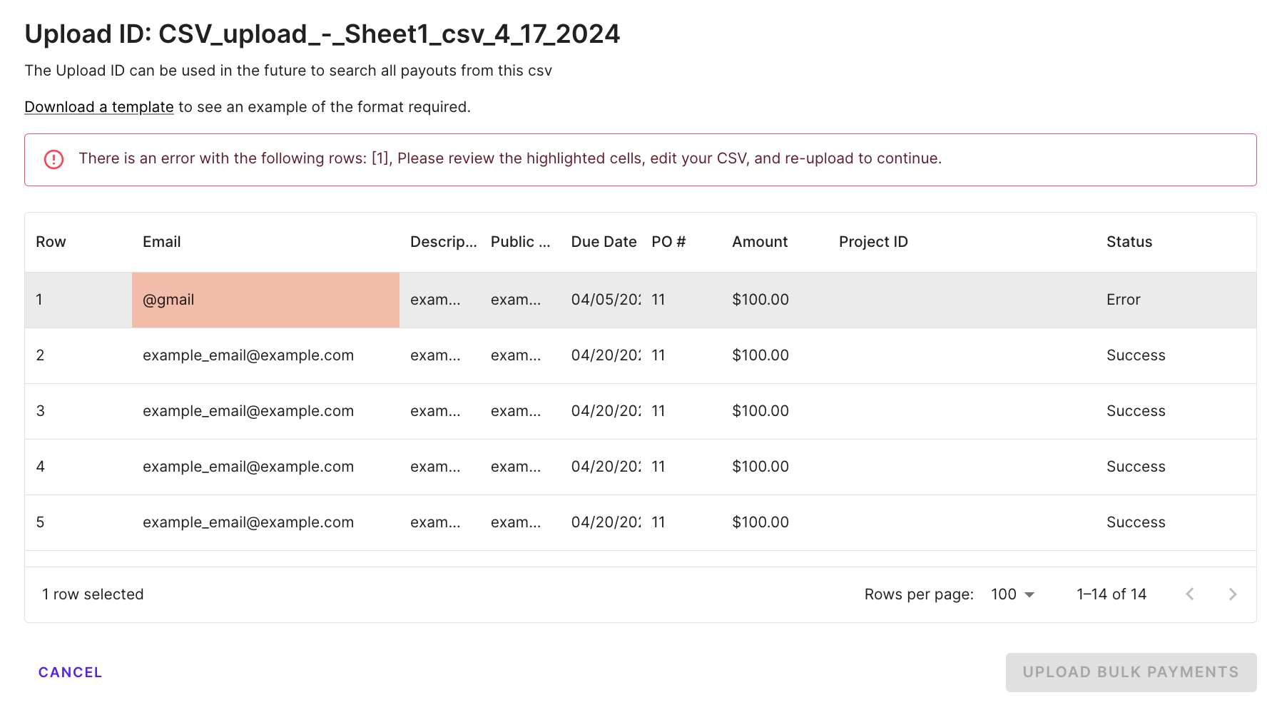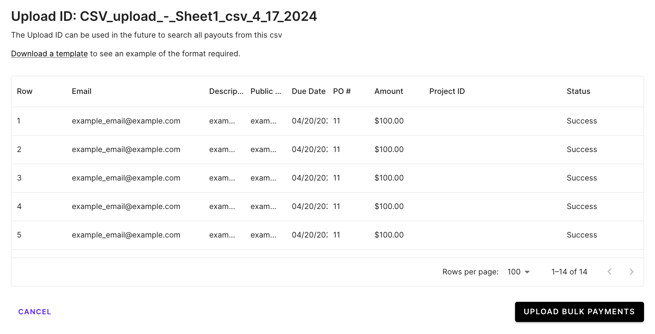 If a large batch (>1000 payouts) is uploaded at once, the system may take a few minutes to complete the upload. Once the upload is complete, the user who uploaded the .csv will receive an email letting them know.