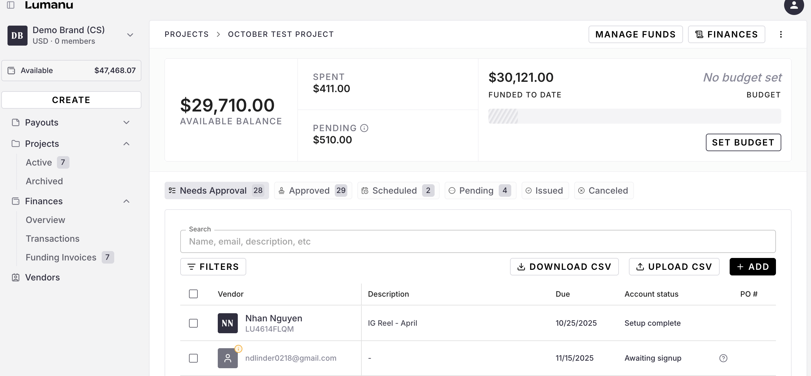 Click Add. The new invoice will populate under the Needs approval tab in your Project.