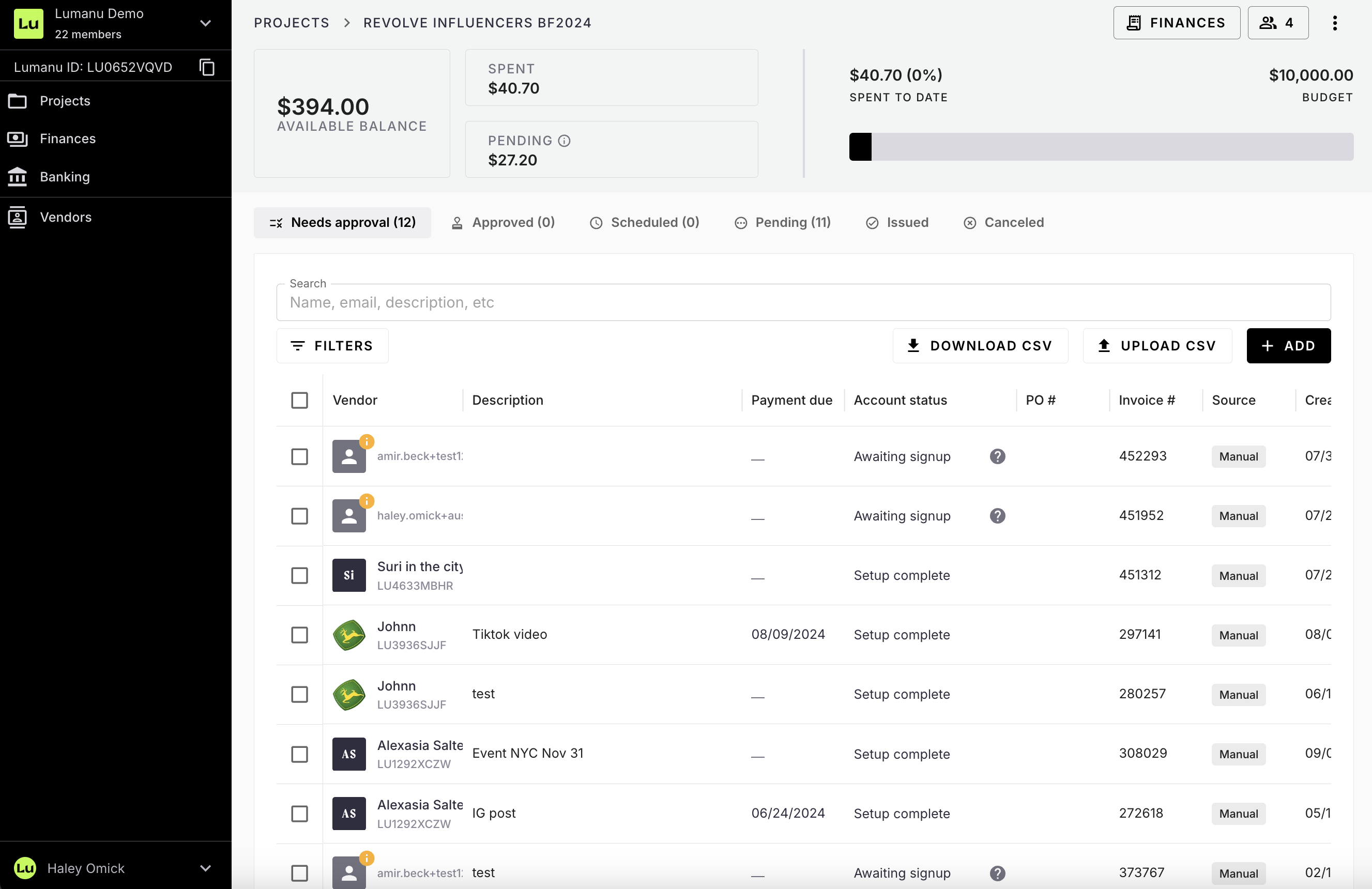 Search for the invoice recipient from your vendor list or enter the recipient’s email address, name, or Lumanu ID.