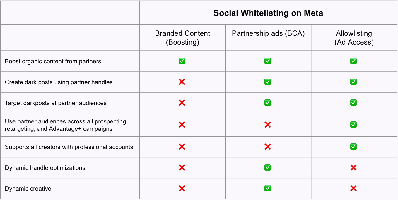 Allowlisting provides the brand with the same level of access that branded content ads does, and then some. Allowlisting gives the advertiser unhindered access to create and leverage influencer handles, content and audiences across ALL Meta campaigns.