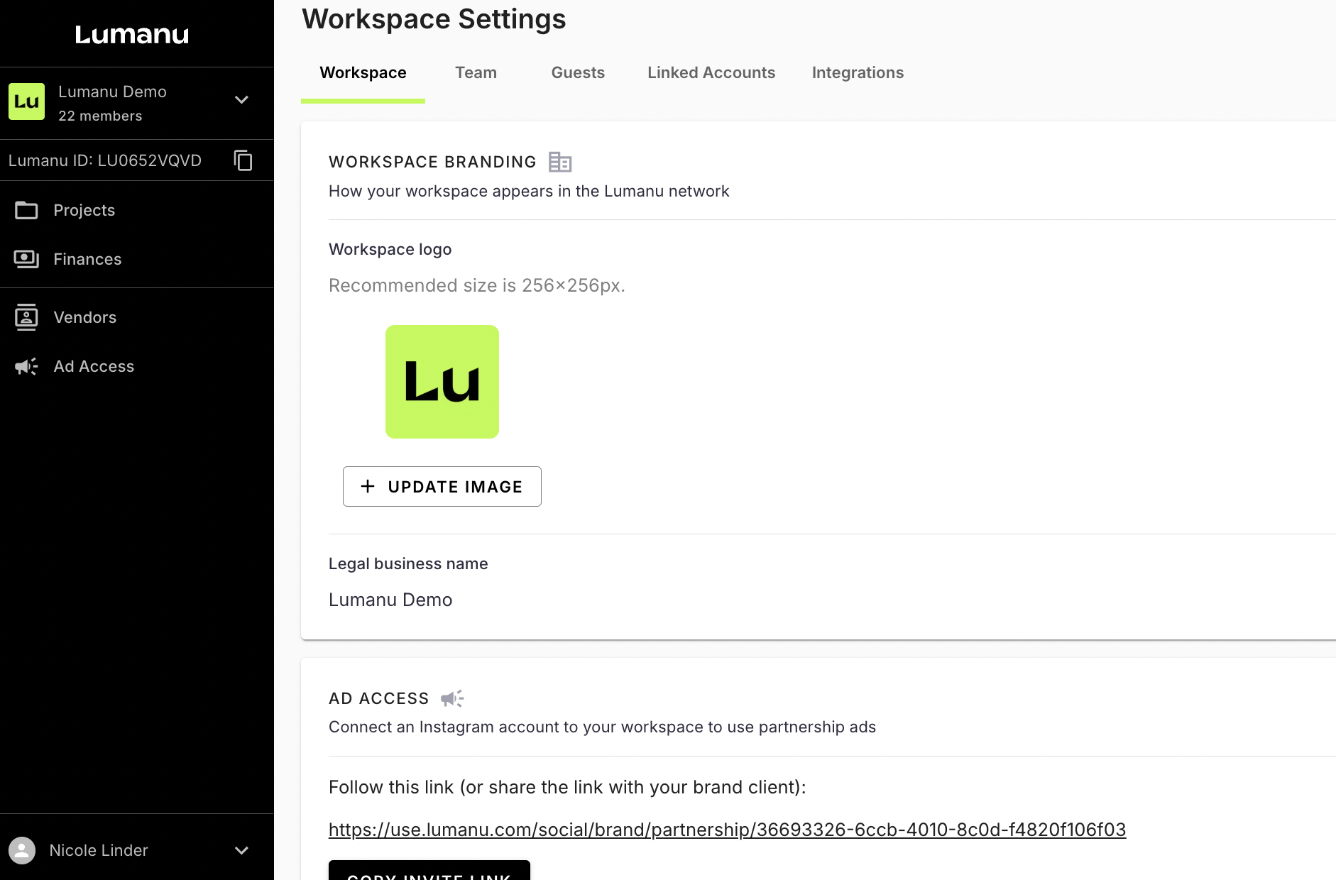 Before your team is able to invite creators to grant Partnership ad access via Lumanu, you will need to grant Lumanu advertising access to your company Instagram account and Facebook Business Page.