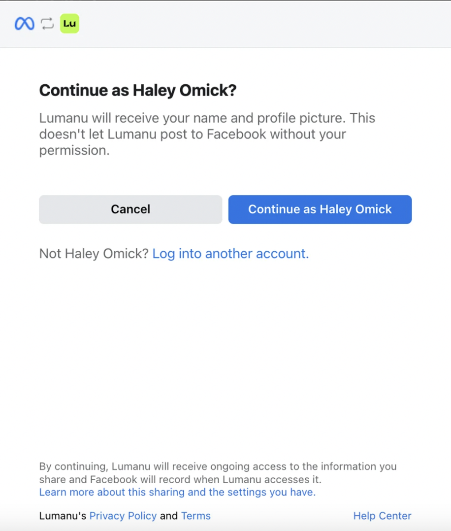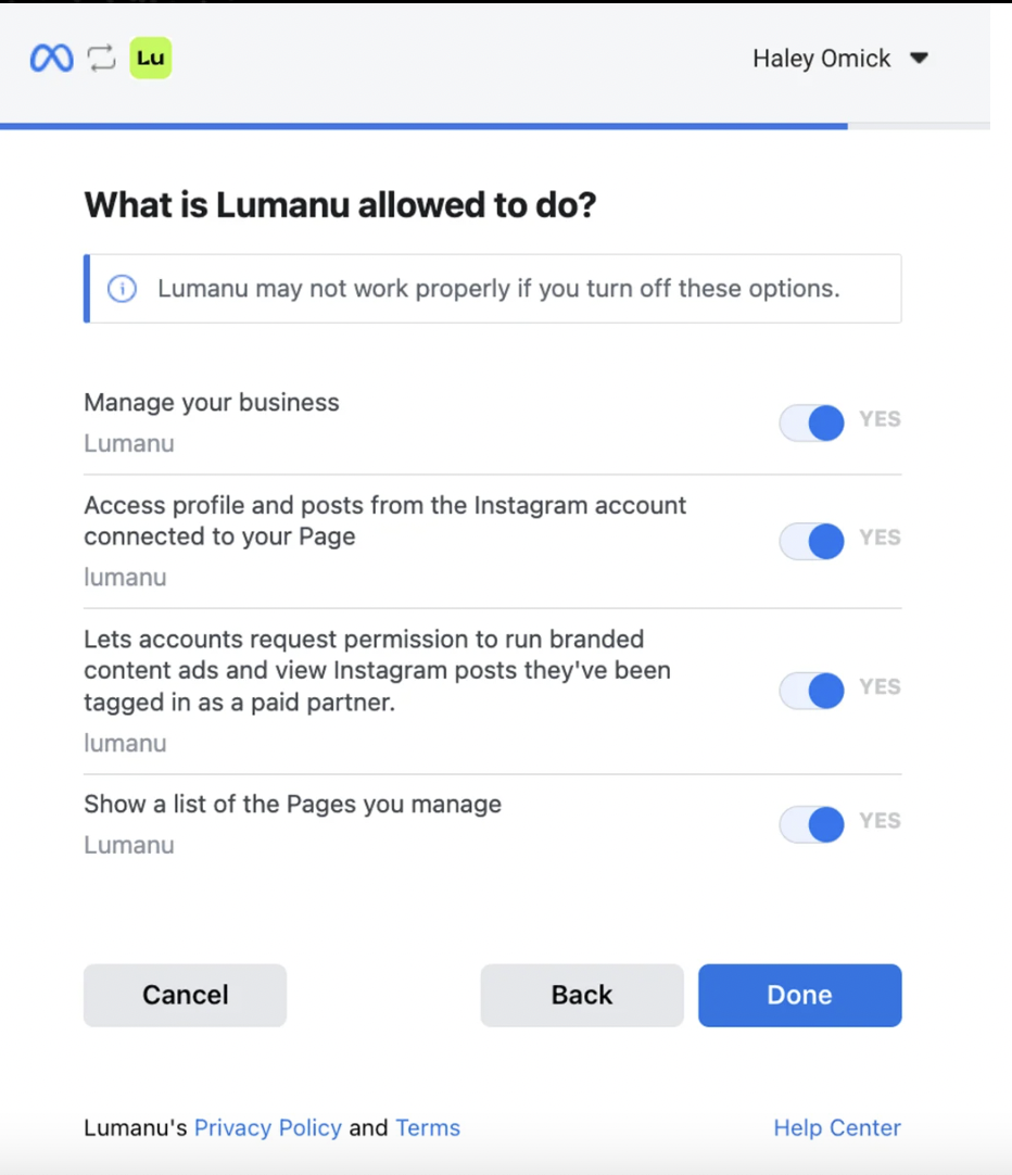 This gives Lumanu the ability to assign itself as an advertiser to the Facebook Business Page you are authenticating.
