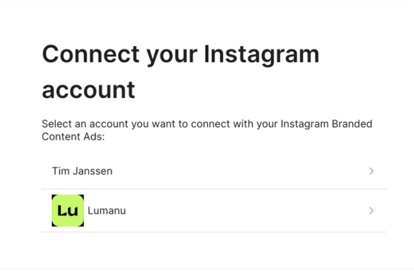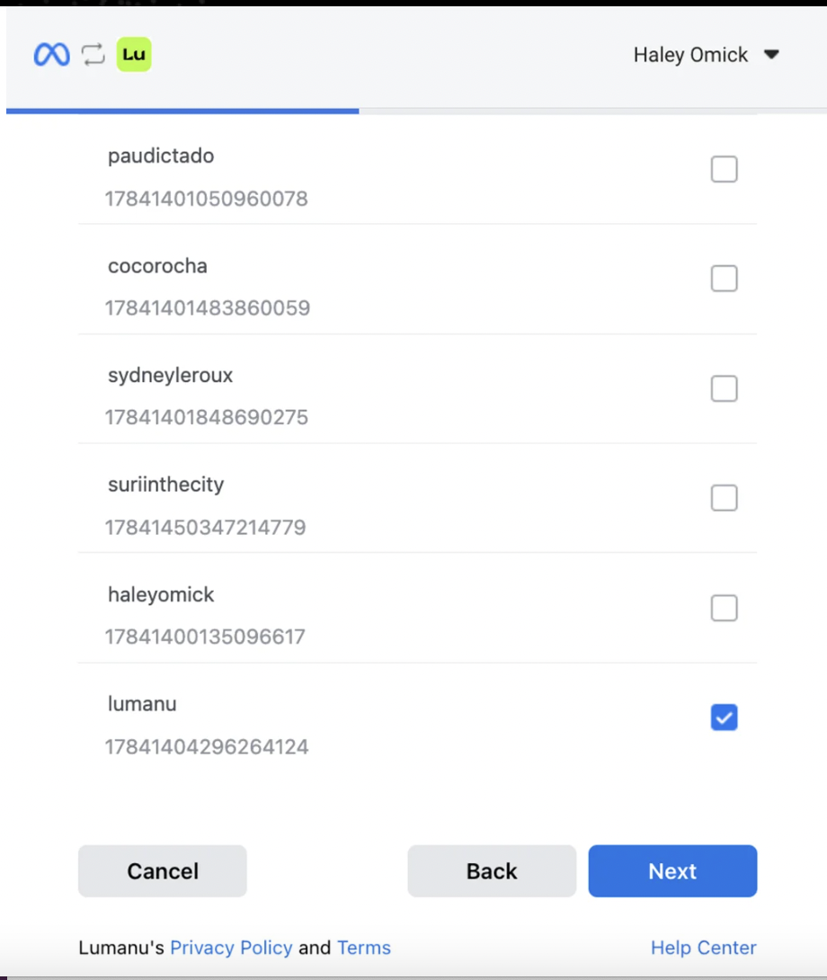 6. Assign Lumanu permissions to your company Instagram and Facebook accounts.