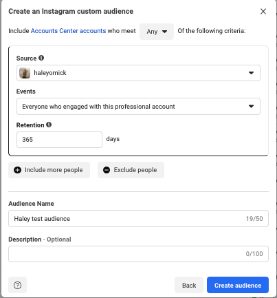 5. Select preferred Event from the Events drop-down, and Retention (the below example would build an audience including everyone who has engaged with Haley’s account in the last 365 days).