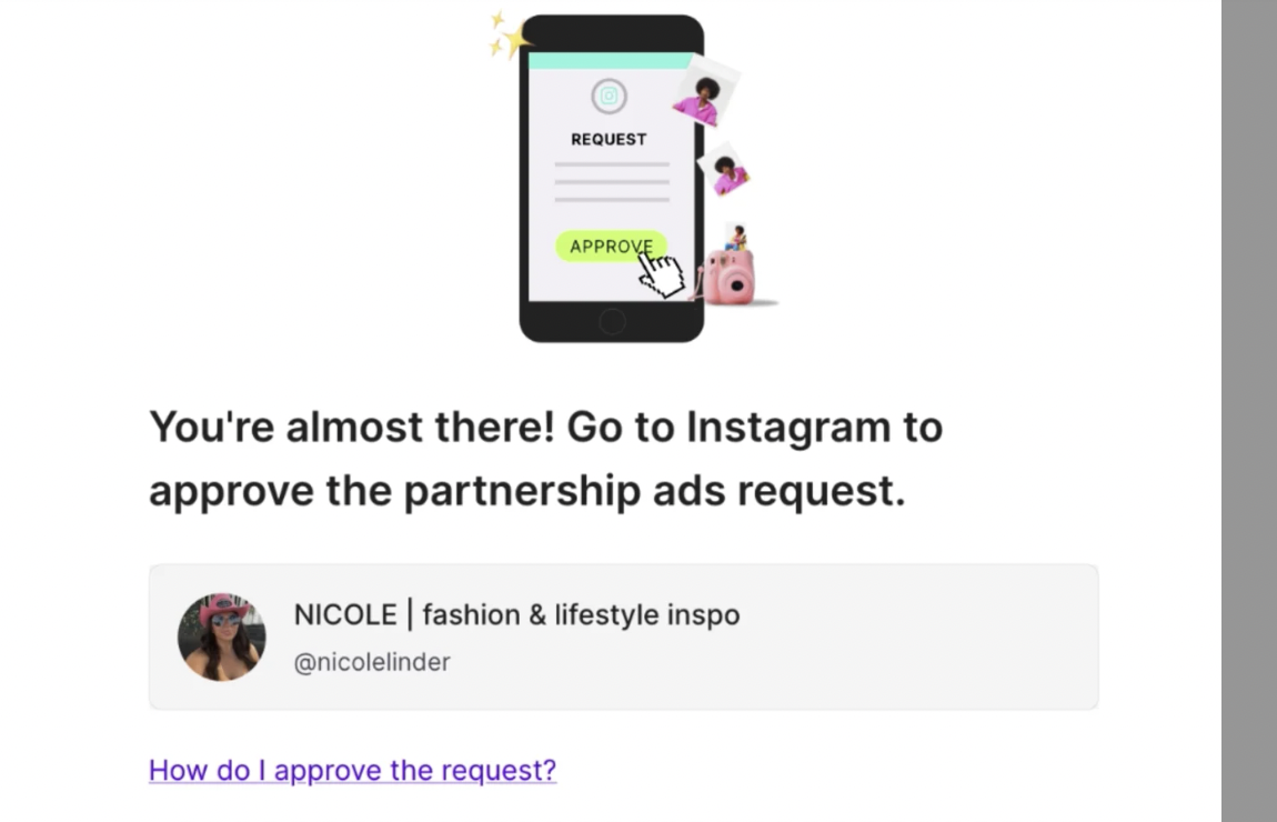 6. Once they have ‘approved’ the Partnership Ad request in their Instagram app, your team will be able to run Partnership Ads via their handle.