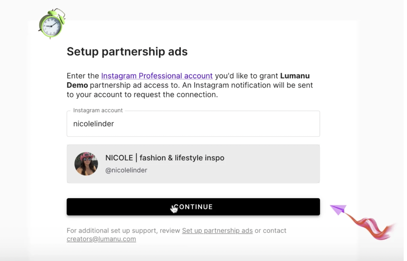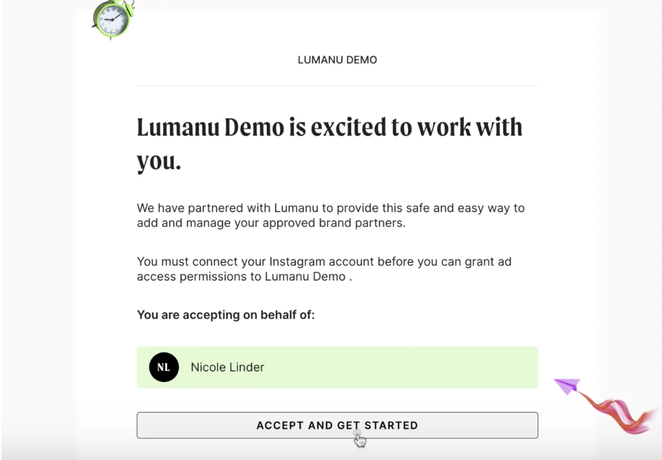 4. Lumanu will send a brand partner request to the Instagram account selected on behalf of your team. They will be redirected to the Instagram app to accept the brand partner invite from there.