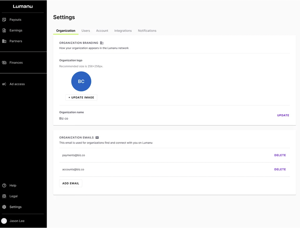 Organization owners, which are currently referred to as ‘super admins’, can update their team’s organization info at any time within their Lumanu account settings. A help article on how to add or delete organization emails can be found here.