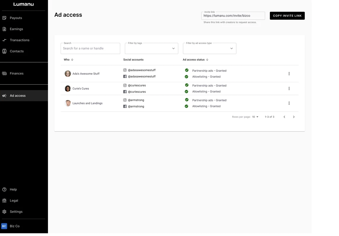 We've combined Partnership Ad access and Allowlisting access into one product (and tab), making it possible for you manage both types of advertising access within Lumanu at the same time. That’s right, you no longer choose between one type of access or the other.