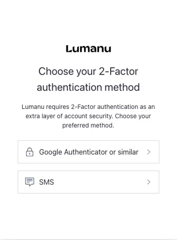 Lumanu requires 2-Factor authentication for all users as an extra layer of account security. This extra verification step helps to protect your account in cases of compromised passwords.