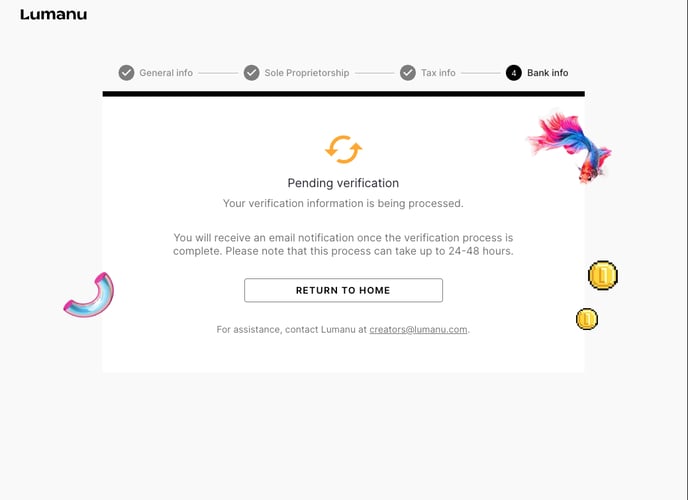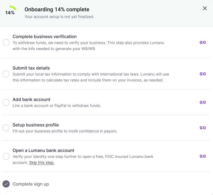 Once your tax information is submitted and accepted by Lumanu, you can verify your Lumanu account by selecting the Finish Setup button in the top corner of the navigation bar.