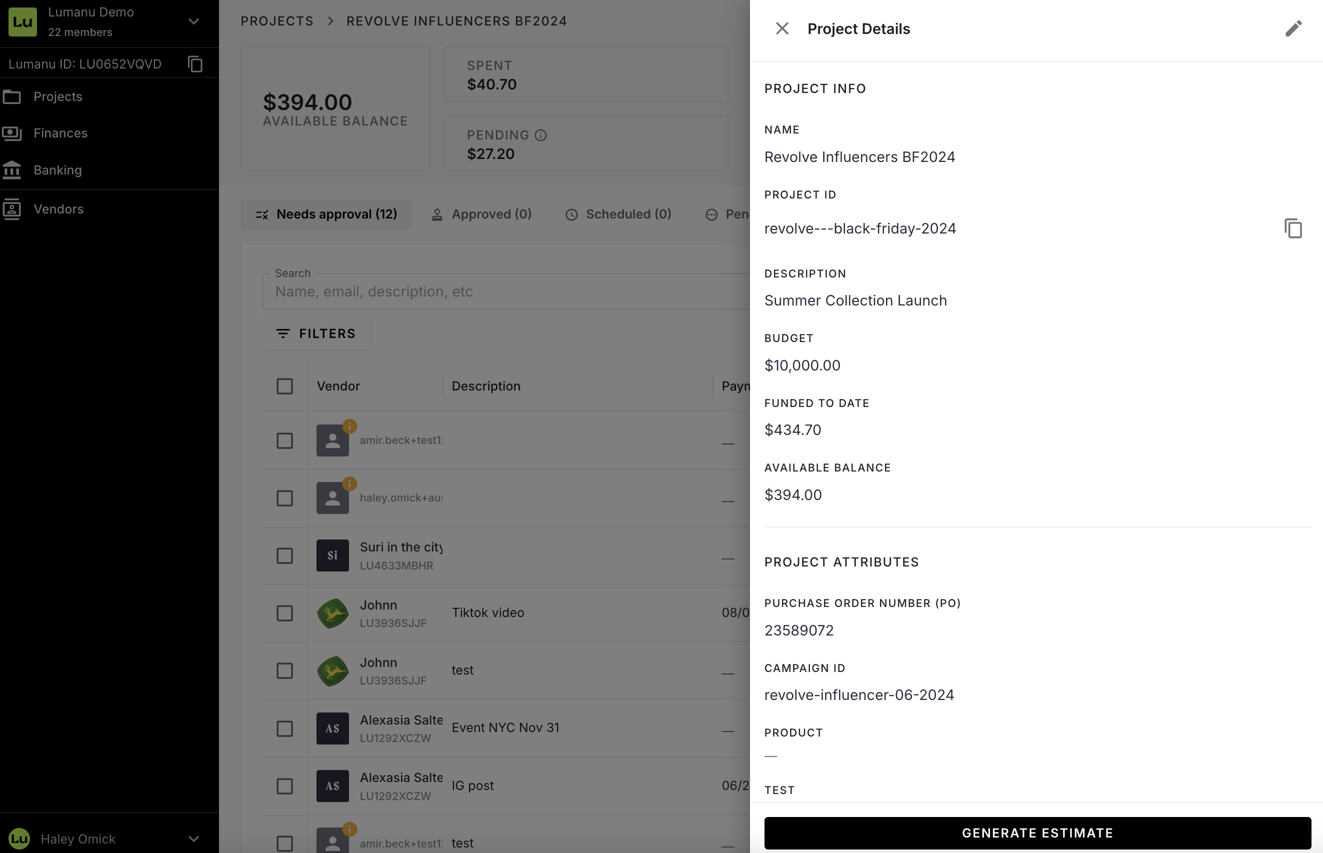 At the bottom of the Projects detail drawer, click Generate estimate.
