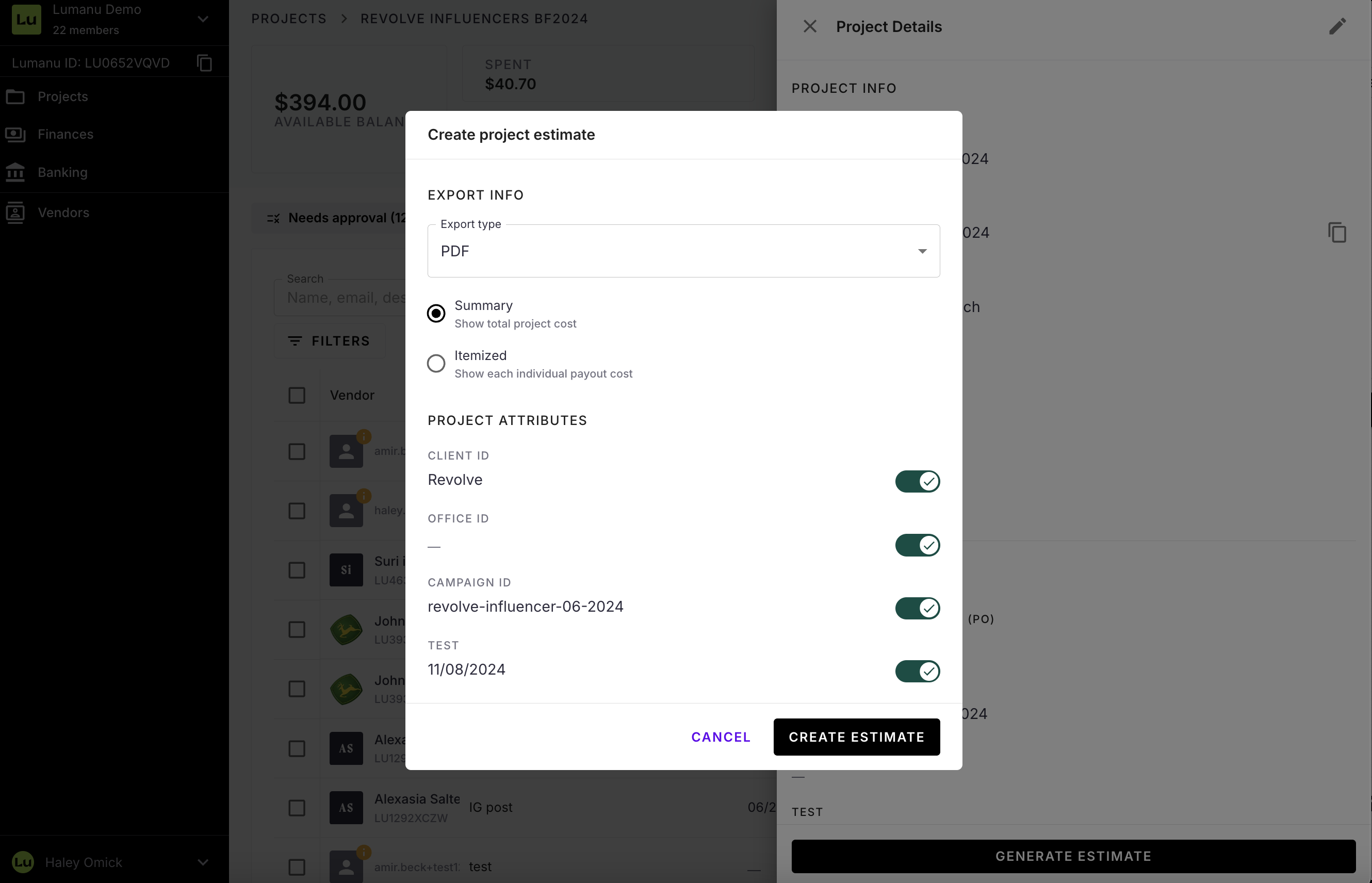 Note: itemized estimates can only be generated if payouts are added to a Project.Fill in the Project Fields section. If a field is not required, it can be toggled off to remove from the estimate.