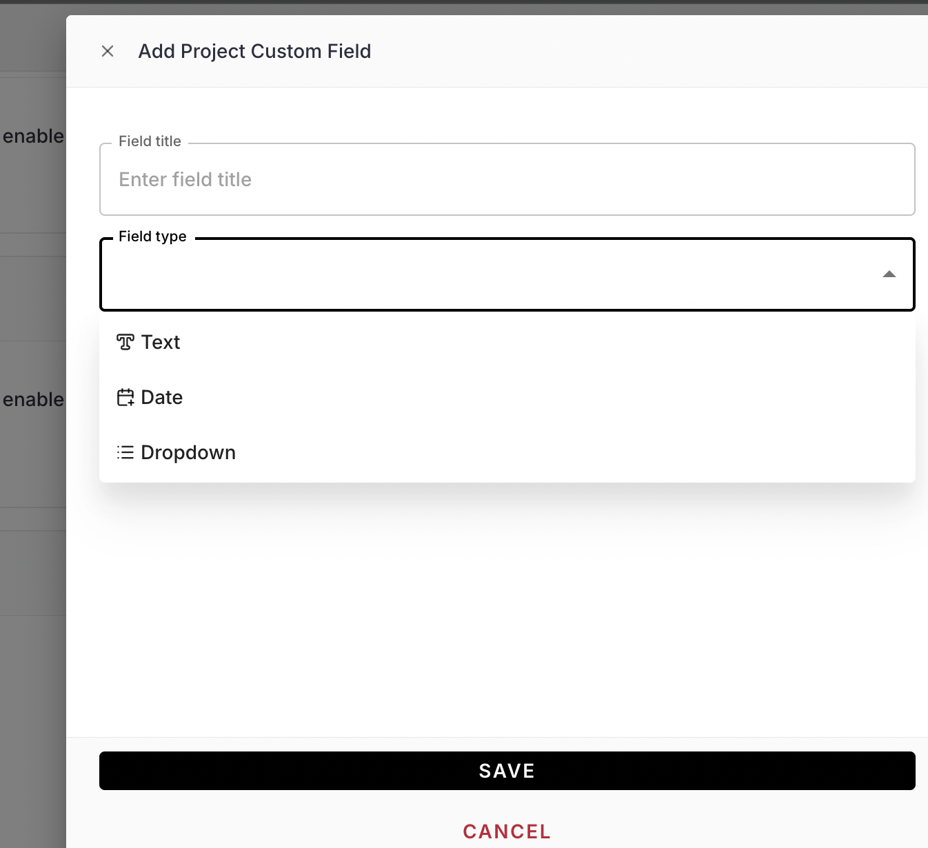 Click Add. Type in the first field you’d like to include on your estimate, then select the field type.