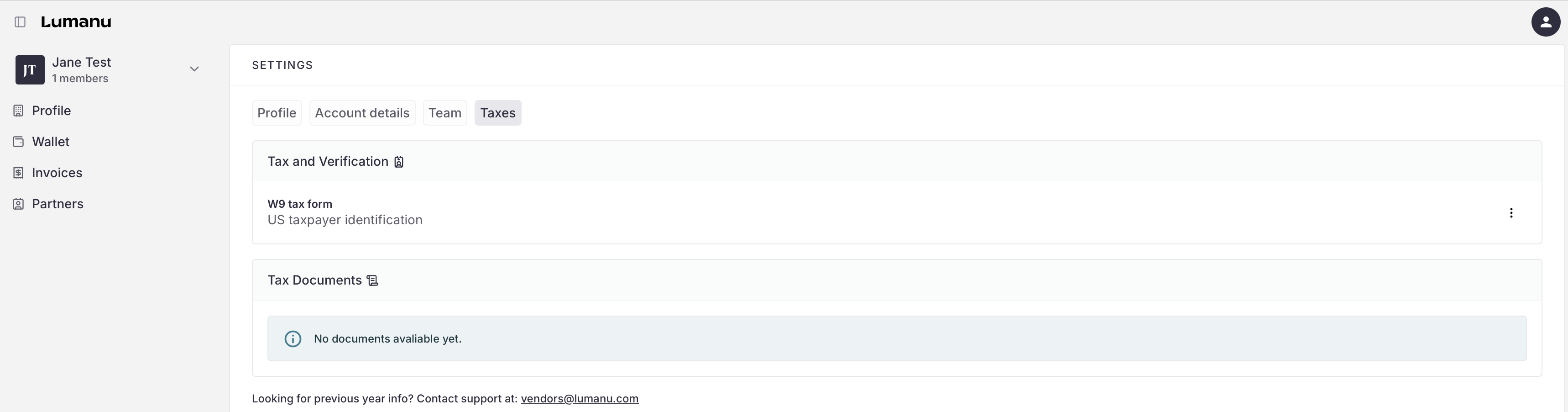 Before withdrawing funds from their Lumanu wallet, users are required to submit their tax information to Lumanu. Lumanu is set up as a third-party settlement group, meaning we handle tax paperwork on behalf of our clients.