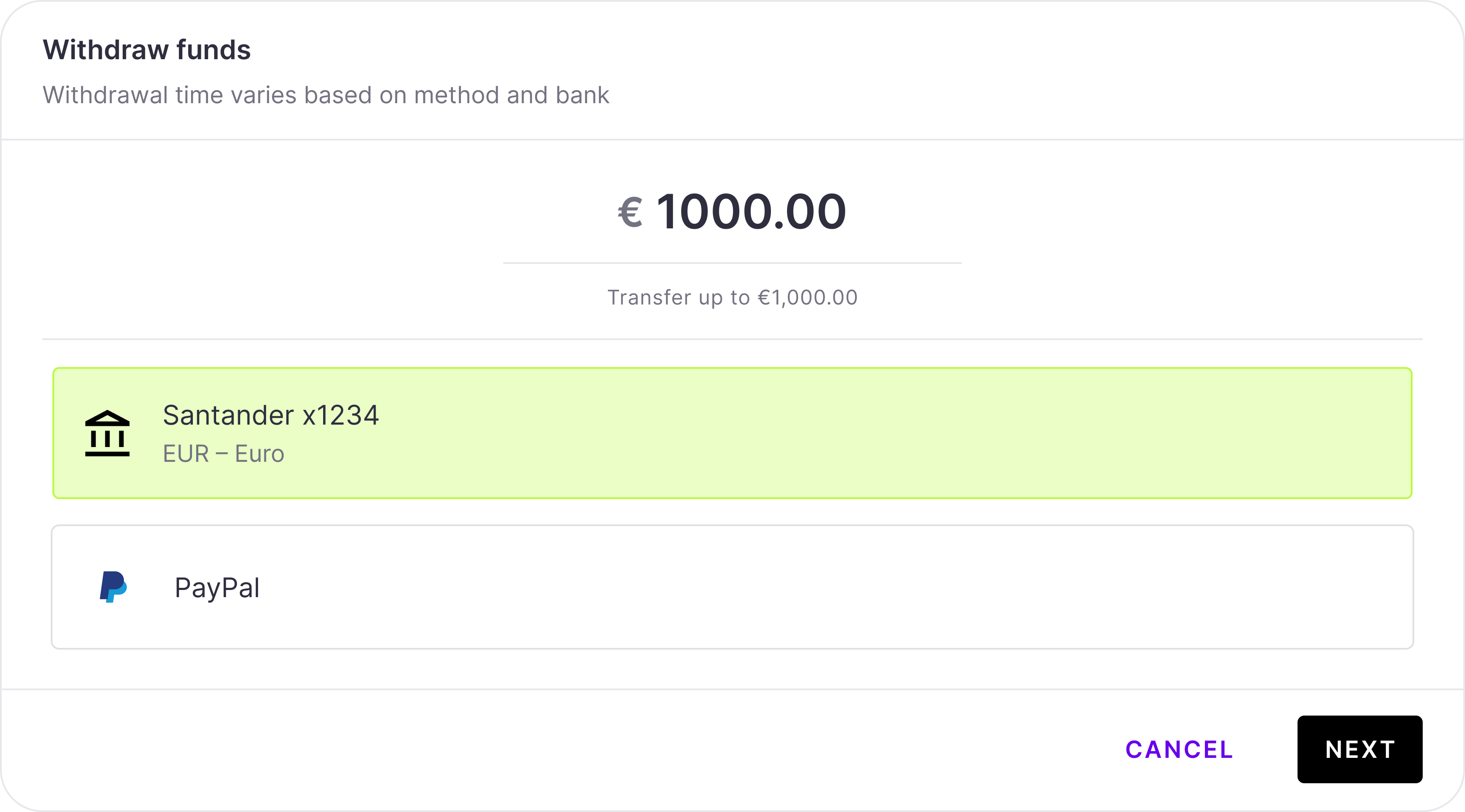 *To use a different withdrawal method than what is listed, click cancel and navigate under your settings to connect a new withdrawal method.