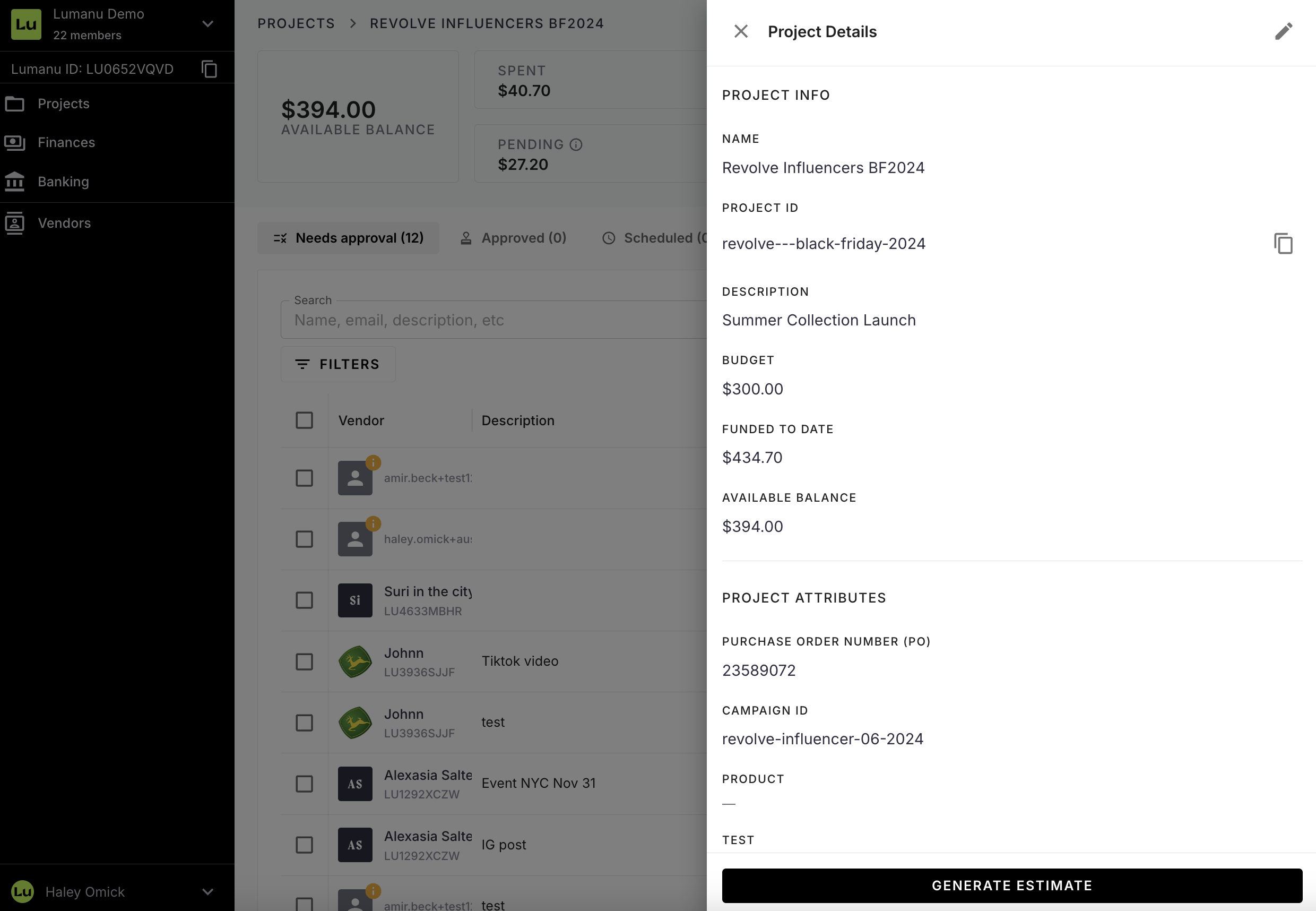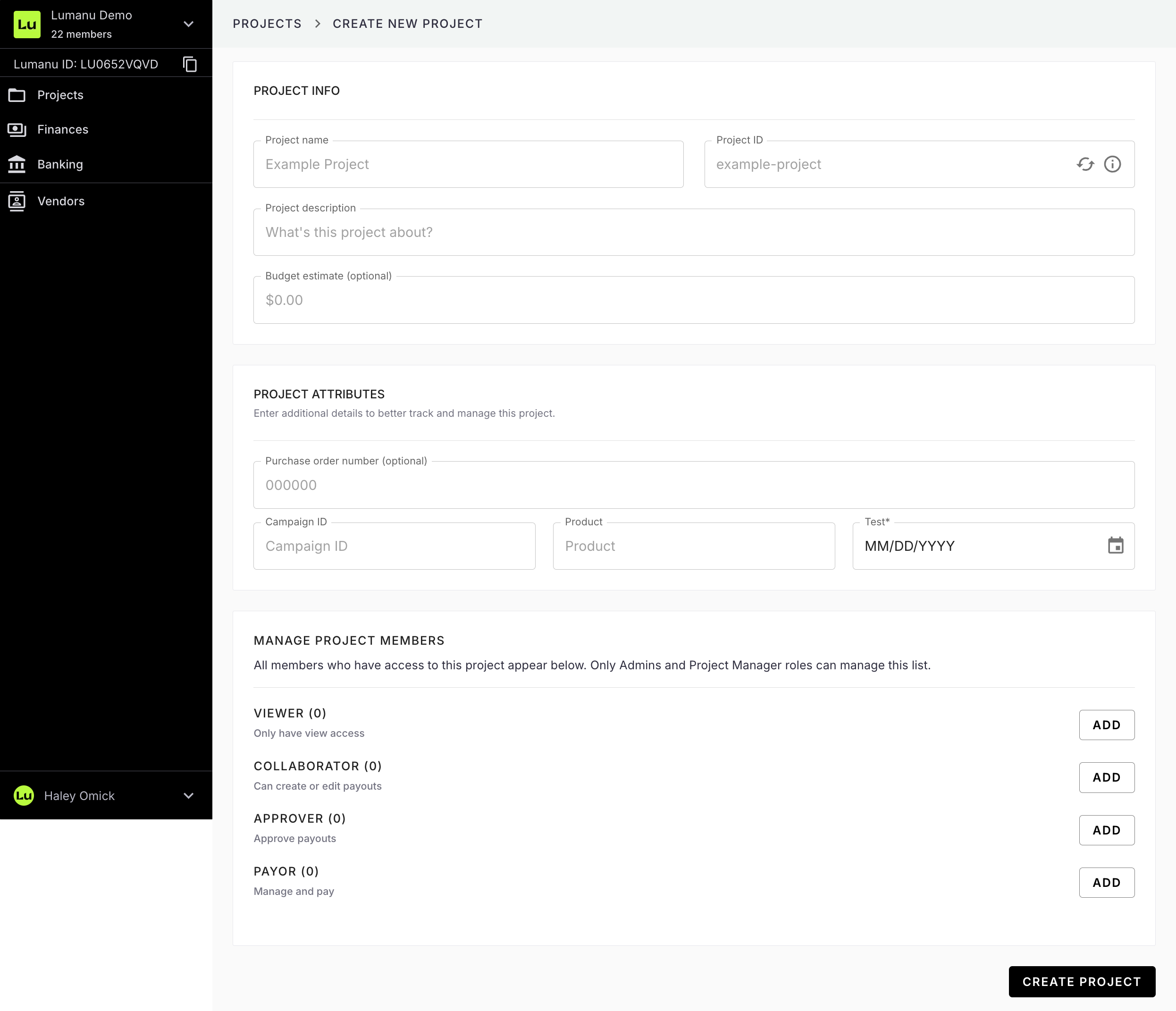 Once created, you can apply your attribute(s) to your Lumanu Projects, keeping your invoices organized and aligned with your team's internal structure.