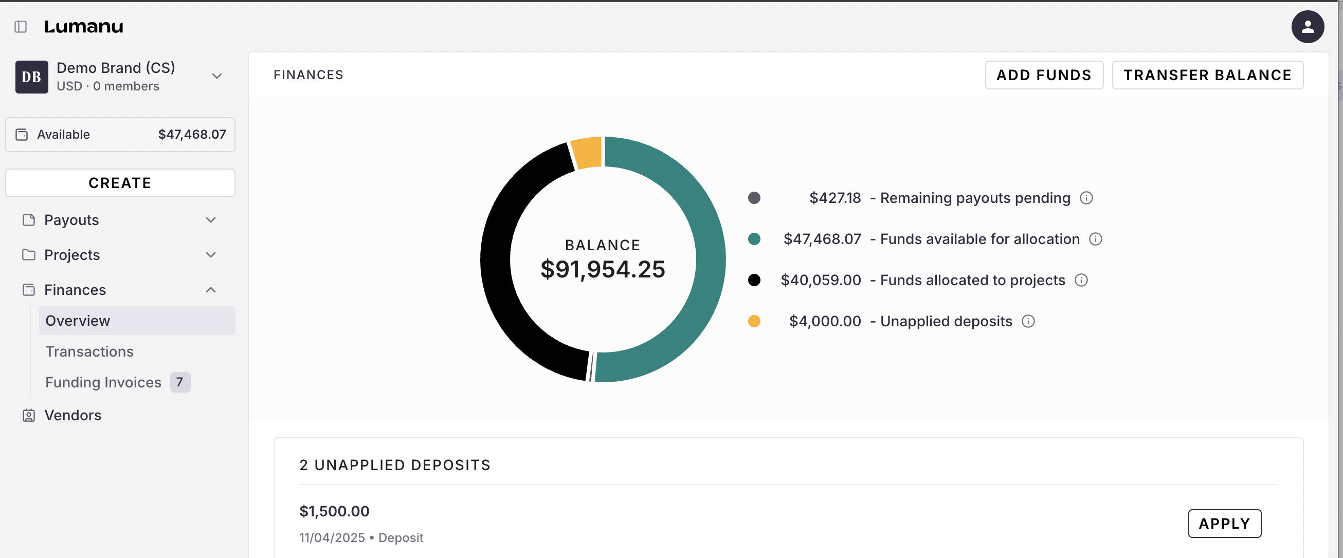 After initiating the transfer on your end, the funds will be deposited into your Lumanu account. You can track the status of the deposit in the Funding Invoices section within Finances. Once the funds are deposited, they’ll be available for immediate use to pay vendors.
