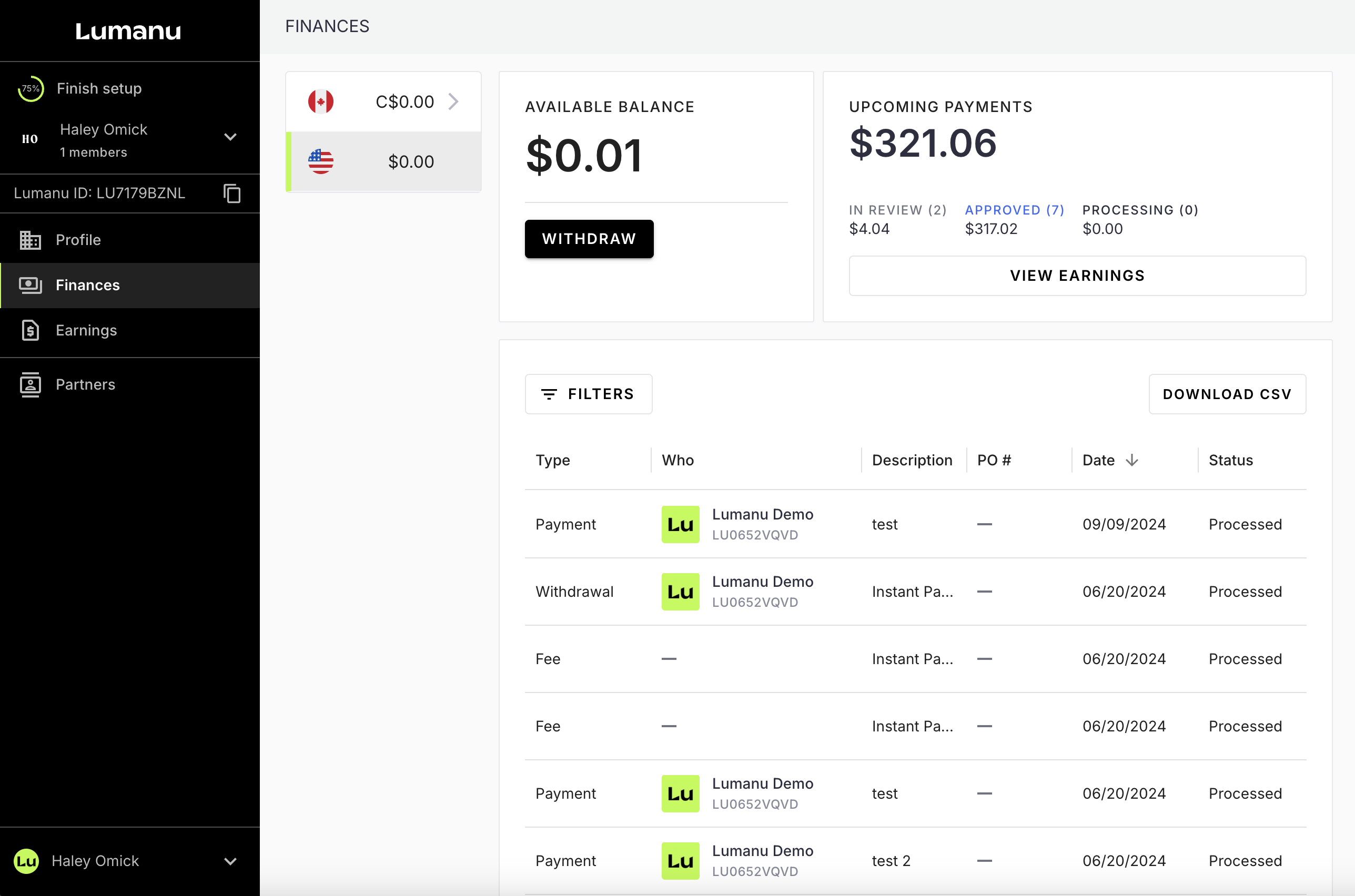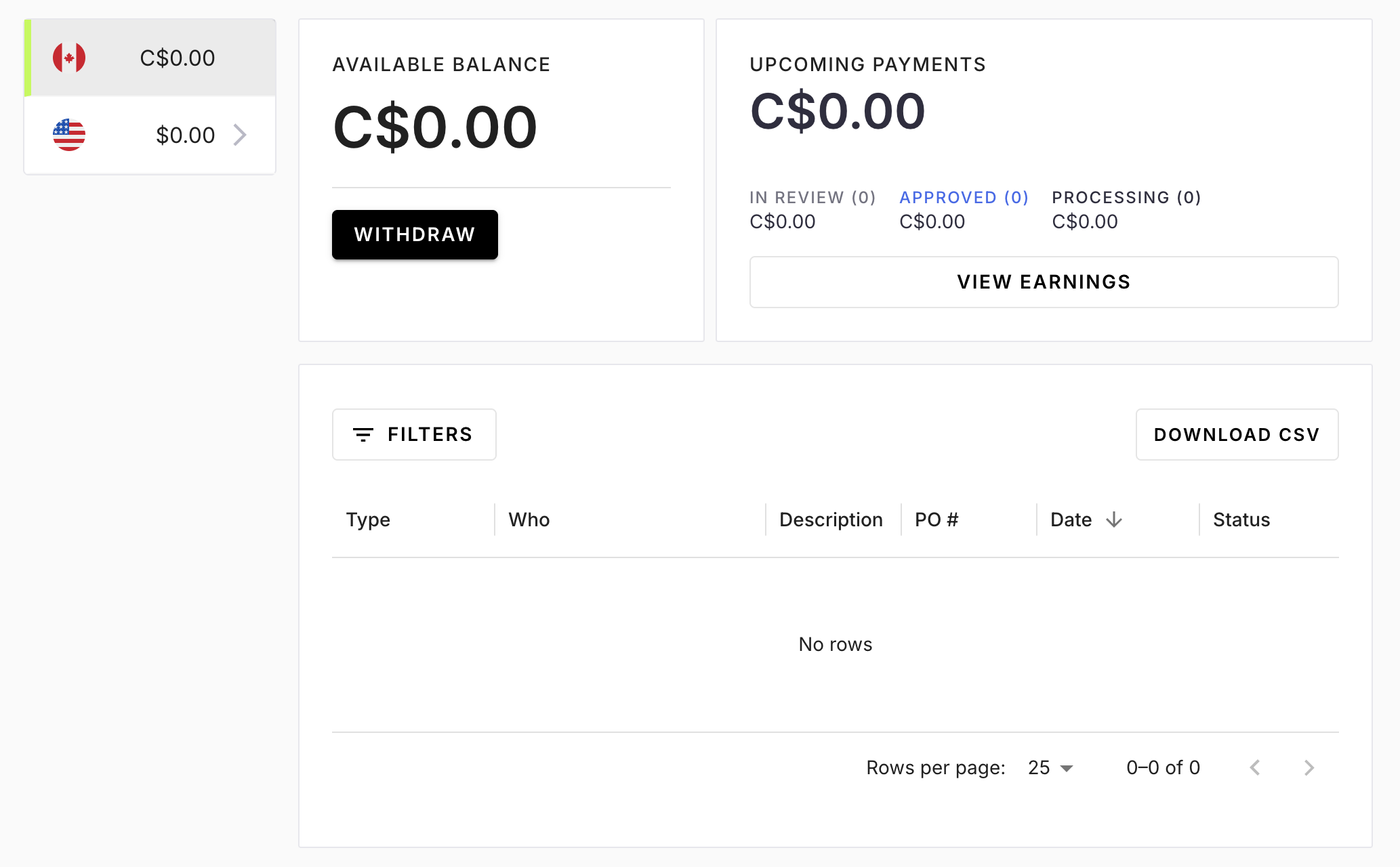 We are excited to introduce a new feature that allows you to receive payments in both USD and CAD! With this update, you now have the flexibility to manage funds in two separate wallets, each with its own linked bank account.