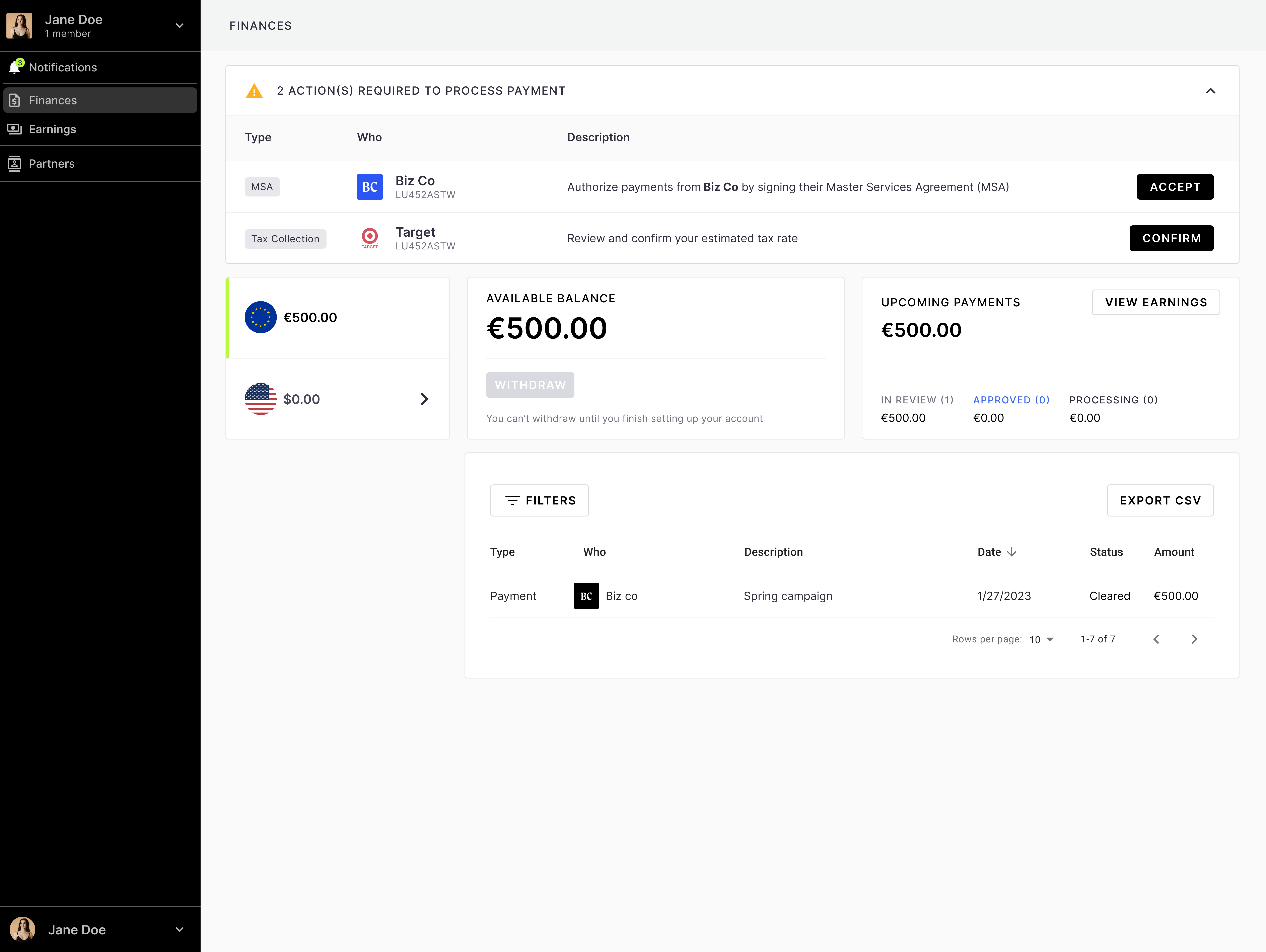 Make sure your business name, tax registration info, and rates look correct. Once confirmed, you’re all set to start receiving payments from your brand partners.