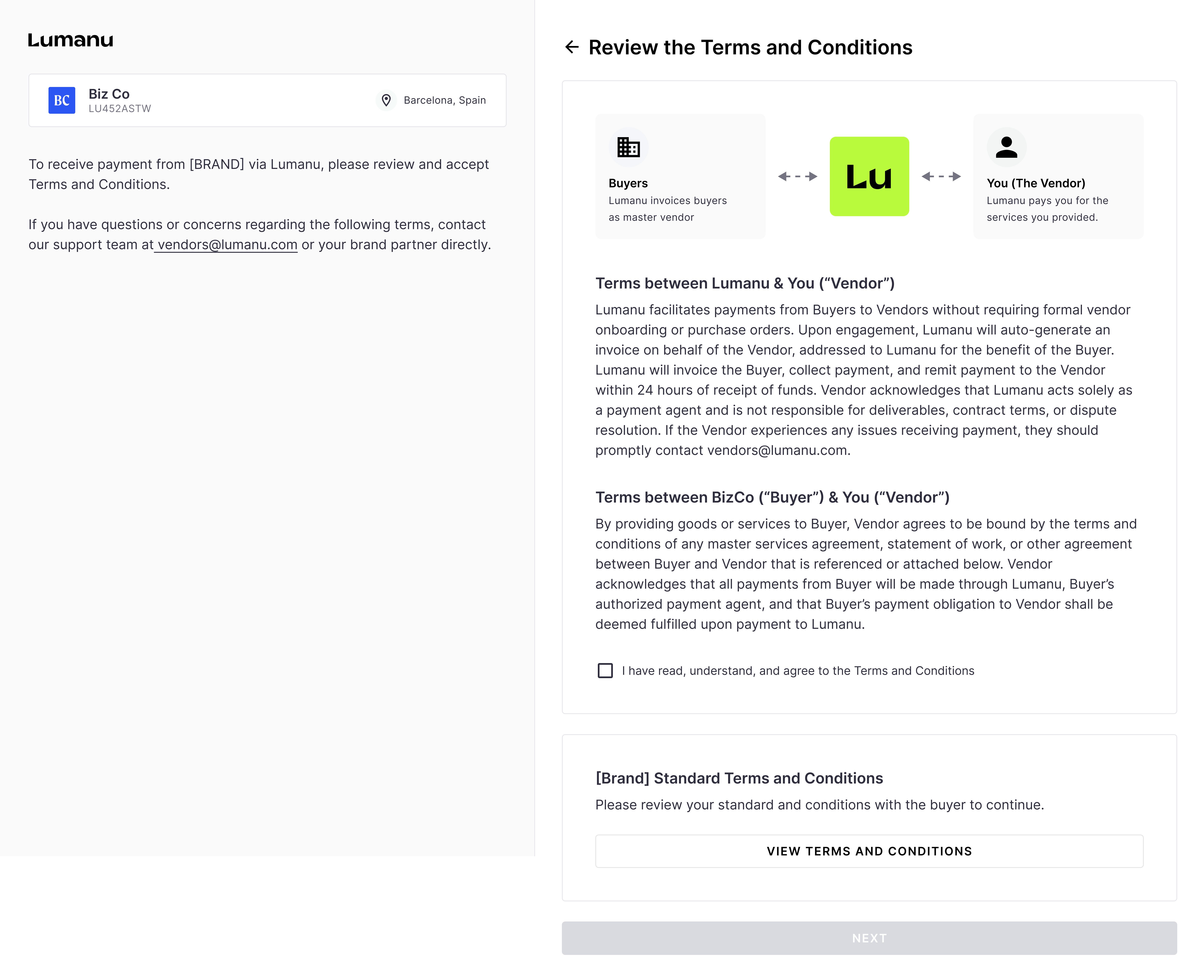 Lumanu’s MSA – This allows Lumanu to securely facilitate payments to you.