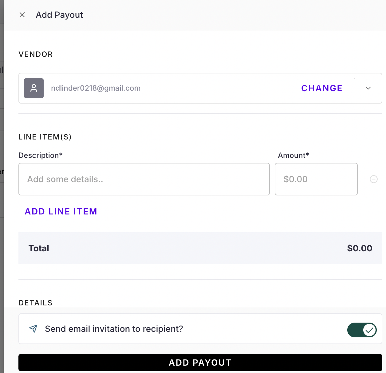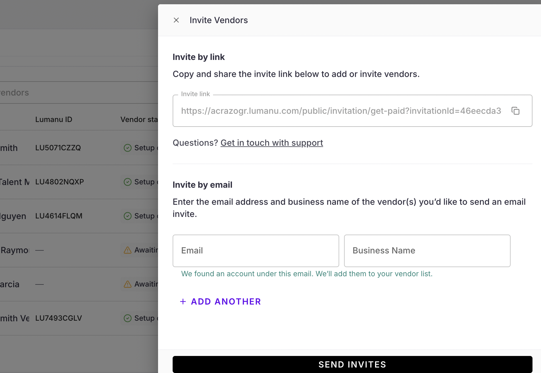 Your team invites a vendor to Lumanu by sharing your custom invite-link or creating an invoice under their email address.